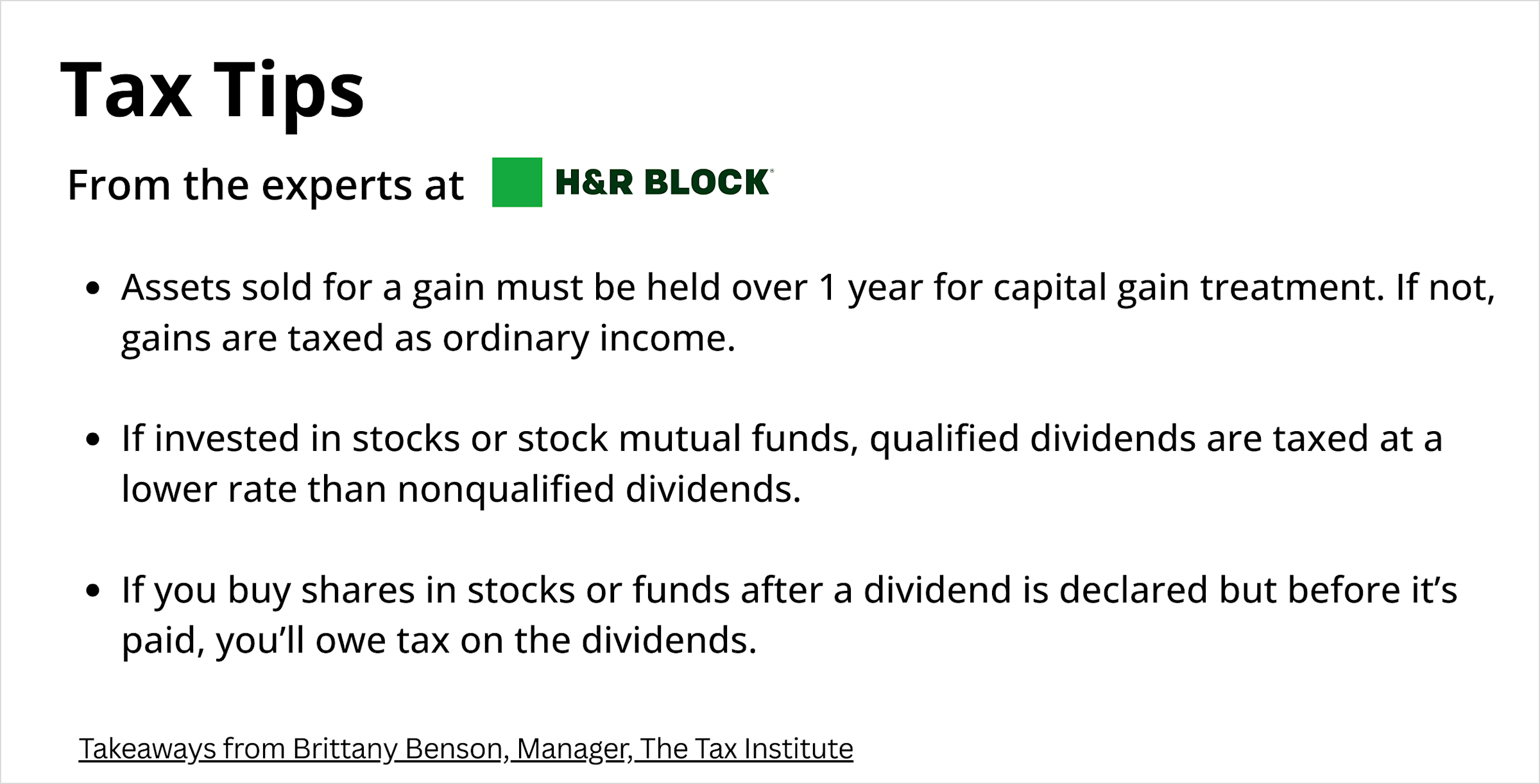 If you receive dividends through stocks, exchange-traded funds, or mutual funds, you’ll likely owe taxes on the income. Here’s what you need to know. Dividends are shares of profit a company gives its shareholders. Most distributions are paid out in cash, but a company may also give additional stock, property, or other assets. Dividend income is taxable. The type of dividend you receive, qualified or nonqualified, determines its tax implications. Nonqualified dividends are the most common payout from a company or mutual fund. They’re generally taxed as ordinary income, subject to federal income tax. Qualified dividends are typically eligible for the long-term capital gains tax rate, which is 0%, 15% or 20%, depending on your income and tax filing status. A qualified dividend has to meet a few requirements to be considered a long-term capital gains distribution. A dividend is generally qualified if: A U.S. corporation or eligible foreign company pays the dividend. The dividend is not interest income, a capital gain, or other payment that doesn’t qualify according to the IRS definition listed in Publication 550. You held the asset long enough, generally 61 days within a 121-day period. The holding period starts 60 days before the ex-dividend date, when a company declares which shareholders are eligible to receive a dividend payout. Here are tax rates for qualified and nonqualified dividends for the 2024 tax year. Qualified dividends may be eligible for the long-term capital gains tax, which is based on your income and tax filing status. Sources: The Internal Revenue Service, Topic no. 409, Capital gains and losses 2025 Nonqualified dividends are taxed as ordinary income. The amount you pay is based on your income and tax filing status. Sources: The Internal Revenue Service, Federal Income Tax Rates and Brackets, 2025. If you received $10 or more in dividends, you should get Form 1099-DIV, which shows how much you received in dividends and whether the dividends are ordinary or qualified. Use this form to complete your income tax return, Form 1040. Even if you don’t receive Form 1099-DIV, you’re still expected to report all dividend income on your tax return. Taxpayers who receive more than $1,500 in dividends will need to complete Schedule B, which is also part of the income tax return. Dividend income is taxable in the year you receive it, so it’s difficult to avoid the dividend tax completely. However, you can lower or manage your tax liability in a few ways. Hold the asset longer: If you keep it beyond the 60-day holding period, it may be eligible for the long-term capital gains tax instead of the ordinary income tax — as long as it meets the other qualified dividend requirements. Set money aside: You could avoid a surprising tax bill if you ask your employer to withhold more taxes throughout the year or make estimated tax payments. The IRS recommends making estimated payments if you expect to owe $1,000 or more in taxes. Consider retirement accounts: Money in tax-advantaged accounts, like a 401(k) or IRA, grows tax-free, including dividend-paying investments. With Roth accounts, in particular, you invest with after-tax money. Withdrawals are generally tax-free as long as they’re after you turn 59 ½. The tax treatment of dividend income depends on whether it’s qualified or ordinary. Ordinary, also called nonqualified dividends, are subject to the federal income tax rate. Qualified dividends, which must meet certain IRS requirements, are eligible for the long-term capital gains tax of 0%, 15%, or 20% based on your income or tax filing status. Yes, you pay taxes on nonqualified dividends, also known as ordinary dividends. The IRS treats nonqualified dividends as ordinary income, so you’ll pay the tax based on your 2025 federal income tax bracket. Dividends are not taxed in retirement accounts as long as they remain in the account. Money in retirement accounts typically grows tax-free until you make withdrawals. Withdrawals are taxed differently depending on the type of account. Eligible withdrawals from Roth accounts are generally tax-free. You’ll pay income taxes on withdrawals from traditional retirement accounts. You pay taxes on stocks you sell for a profit. How much you pay depends on how long you hold the stock, your income, and your tax filing status. Tax season has begun, but there are still ways for retirees to reduce their 2025 tax bill. Find out how much you’ll owe when you file your 2025 and 2026 tax returns, and learn how to pay less by reducing your taxable income. Learn how Roth IRA tax benefits can complement your overall retirement plan. We explain important contribution, distribution, and income rules for 2024. Typically, you must pay taxes on CD interest. But there are ways of getting around this rule. Learn how to avoid taxes on CD interest. Typically, you must pay taxes on CD interest. But there are ways of getting around this rule. Learn how to avoid taxes on CD interest.