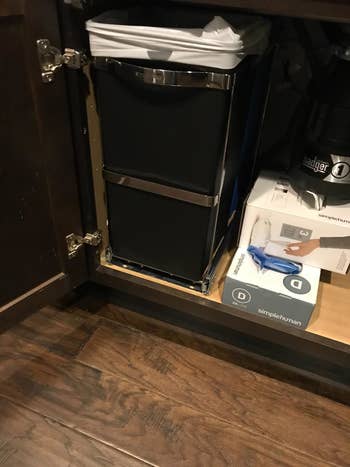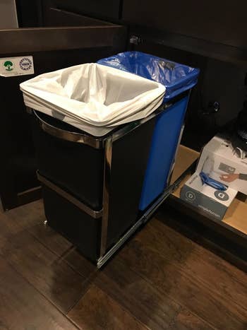 Promising review: "Products by Simplehuman are like the Lamborghinis of the kitchen. Their functionality, ease of install, and years of use you’ll get is worth the spend. I installed mine at an angle so the cabinet door wouldn’t bang into it. My dimensions were spot on, not leaving lots of wiggle room. Word of caution: The liners that Amazon recommends as an add-on are 'D.' But the main garbage can is 'G' and your recycling is 'D.' The recycling liners should be blue, which at the end of the day isn’t a big deal, but I would’ve preferred having the corresponding color with the liner." —Monica Lafuente