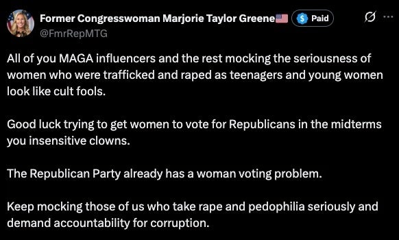 “All of you MAGA influencers and the rest mocking the seriousness of women who were trafficked and raped as teenagers and young women look like cult fools,” she wrote on X. “Good luck trying to get women to vote for Republicans in the midterms you insensitive clowns.”