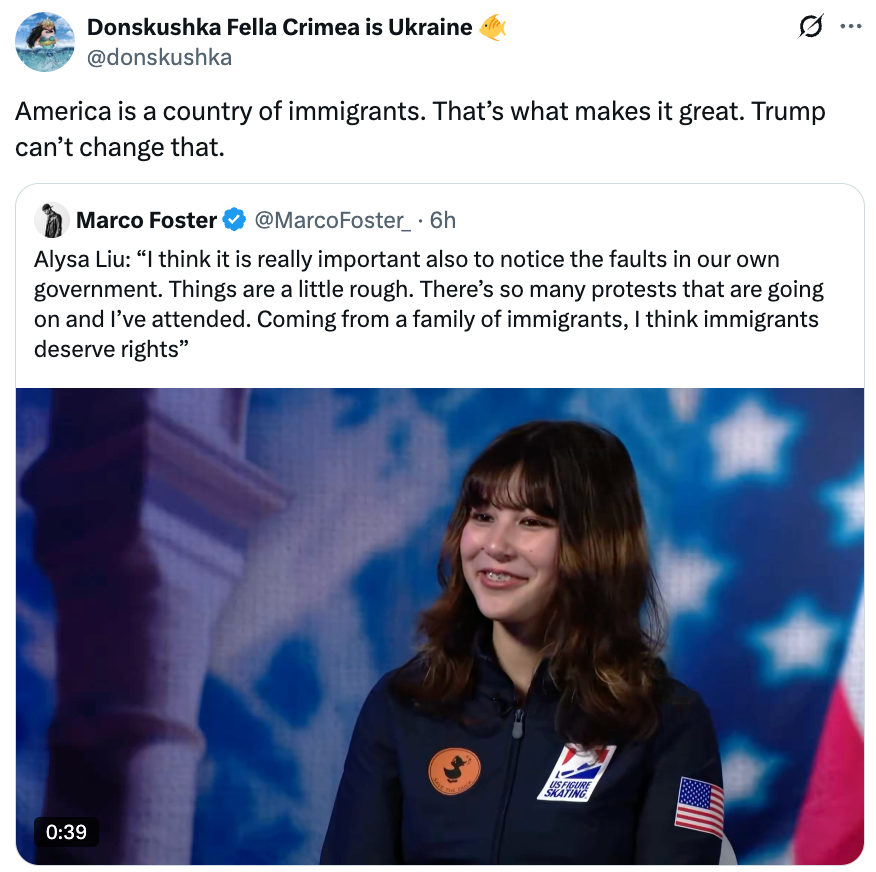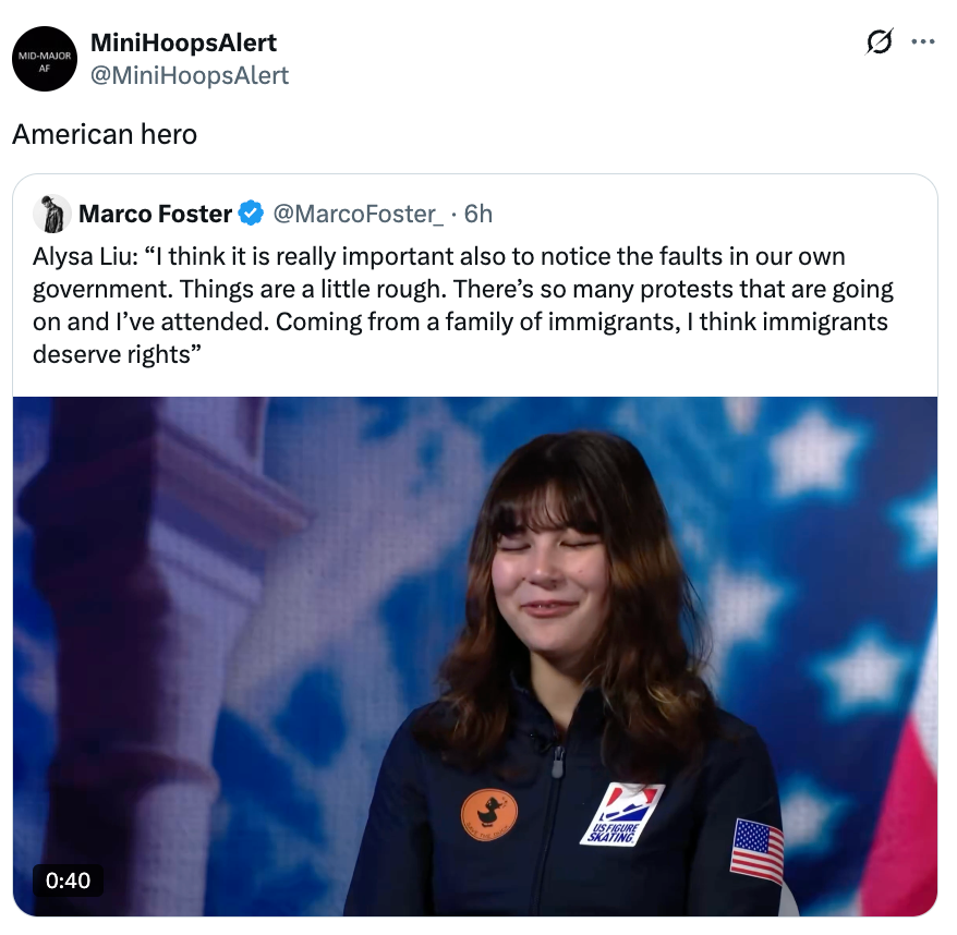 Alysa Liu: “I think it is really important also to notice the faults in our own government. Things are a little rough. There’s so many protests that are going on and I’ve attended. Coming from a family of immigrants, I think immigrants deserve rights” pic.twitter.com/jRt3iiXjRD