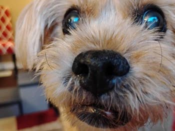 Promising review: "My cockapoo had tearstaining as a pup, but as an adult, he just gets that goop in the corner of his inner eyes. Sometimes I don’t catch the goop fast enough and it hardens in his muzzle. Even when I do, the goop is slimy and difficult to remove, even with dog wipes. This tool is a miracle! Small, lightweight, and a good value for the price. Just one comb-through and I got the sticky wet goop. A few more comb-throughs and I found eye gunk that was buried in his muzzle. Most importantly, this comb removed the debris without causing any discomfort to my pooch. In fact, he seemed to enjoy it! Just look at the pictures." —Joanna