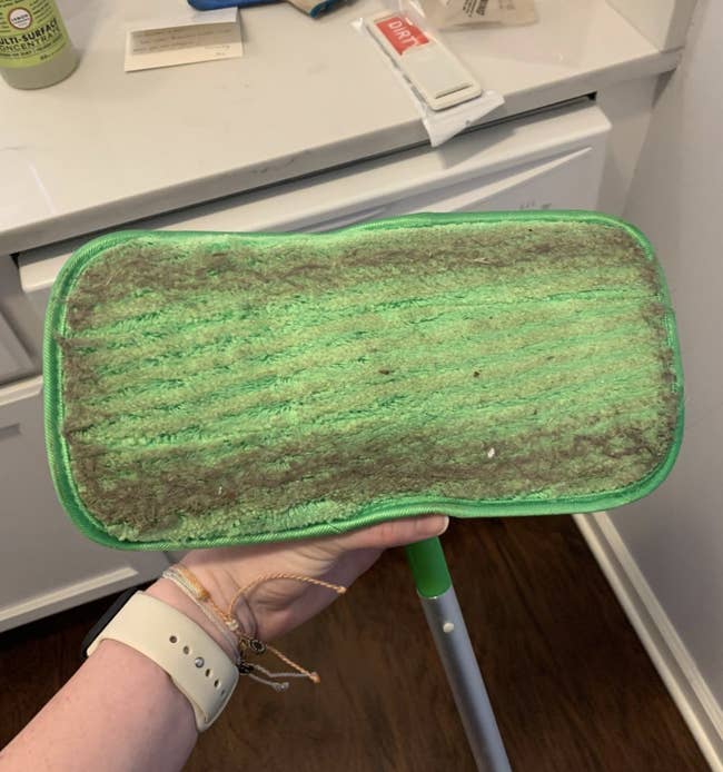 Promising review: "I bought these for the same reasons most do — to be more environmentally friendly. I like the size of my Swiffer Sweeper, but I always felt like I wasn't getting my floors fully clean. We recently got a new apartment, and I always like to deep clean before we do any major moving. I used them dry and wet. I've always been disappointed with how the disposable pads from Swiffer (barely) picked up dog fur and crumbs, but as you can see in the picture, it picked up so much! This was already after using a traditional broom. Then, using them wet with diluted Mrs. Meyers cleaning concentrate — wow! The water was BLACK by the time I was all done with our downstairs area. They were so easy to Velcro on and off, wet or dry. Once I was all done, getting them off and doing a quick rinse wasn't hard at all. I love that I am supporting a small family business with all the convenience of Amazon. I will definitely buy again (if I ever have to). I am so excited to use these for years to come and have a cleaner house than I ever have before!!" —Kathryn Willer