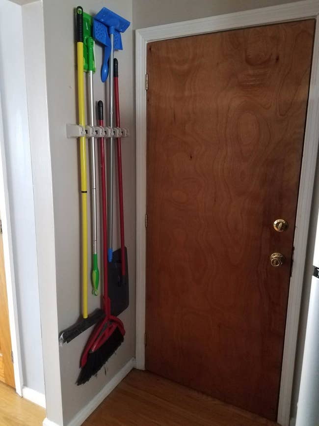 Promising review: "I have a small apartment, and the broom closet was always a mess, with the brooms hitting me in the face whenever I took the trash out. This saved me so much stress! The slots have little rollers and they move to fit just about any-size mop or broom. There are also little hooks that can drop down if you want to hold towels or the dustpan, which is what I use it for. This is a must-have organizational tool!" —Jacqui Nibbelin