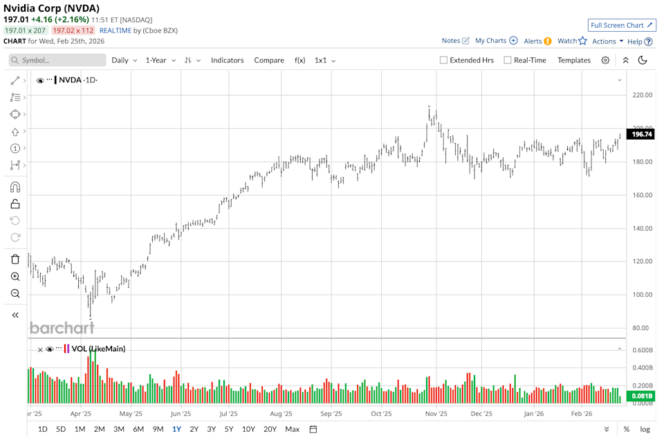 Nvidia (NVDA) is gearing up to re-enter the consumer PC space with AI-centric laptop chips set to be launched this year in laptops from Dell Technologies (DELL), Lenovo (LNVGY), and other makers. Though the financial implications of this move will be minimal at the moment, it does reflect Nvidia’s intentions to further strengthen its position in the AI space beyond the datacenter and into the world of edge computing. The timing of this move also seems quite interesting, with Nvidia shares currently trading at around $197, just below their 52-week high of $212.19. Nvidia has seen a massive rally in recent times due to the AI boom. Wall Street will be keen to see whether the data center business will sustain its explosive growth. Nvidia’s move into AI-powered PCs will add to the strength of its overall strategy in the AI space. 3 Highest Rated Dividend Kings for Generations of Income Nasdaq Futures Gain With All Eyes on Nvidia Earnings GE Aerospace Is Linking Up with Palantir. Should You Buy GE Stock Here? Markets move fast. Keep up by reading our FREE midday Barchart Brief newsletter for exclusive charts, analysis, and headlines. Operating in the Santa Clara, California area, Nvidia develops graphics processing units (GPUs), artificial intelligence (AI) accelerators, and system-on-chip (SoC) products. Its products are used in the data center, gaming, and automotive markets. It has a market capitalization of around $4.69 trillion, as one of the largest companies in the world. In the last 52 weeks, the stock has traded between $86.62 and $212.19. It has risen substantially in the last year, growing much more than the S&P 500 Index ($SPX). Its recent gains are due to strong earnings and continued AI infrastructure spending. Currently, the stock is trading at a forward price-earnings ratio of 27.24x. The stock has a trailing price-earnings ratio of 49.75x. The stock has a price-sales ratio of 25.33x. All these ratios are higher than the average ratios in the semiconductor industry due to the company having higher profitability ratios. For instance, the company has a profit margin of 55.85%. The return on equity stands at 99.24%. The gross margins are higher at over 73%. Nvidia pays a quarterly dividend of $0.01, with the last one being made on Dec. 26, 2025. The upcoming payment will take place on March 27. However, the company’s income is not a major aspect in investment decisions. On Nov. 19, the company announced a record third-quarter revenue of $57.0 billion, representing a 22% sequential gain as well as a 62% year-over-year (YOY) gain. The Data Center revenue stands at $51.2 billion, showing a 25% quarterly gain and a 66% YOY gain. In terms of earnings per diluted share, both GAAP and non-GAAP earnings per share are $1.30, with the gross margins at 73.4% and 73.6%, respectively. These figures represent strong demand for AI infrastructure products. Further, the tech giant has witnessed a huge sale in Blackwell chips, in addition to a sold-out cloud GPU capacity. In the first nine months of fiscal 2026, the company has returned $37.0 billion in shareholder repurchases and dividends. In addition, it has $62.2 billion remaining in its authorization. This reflects strong cash flows, despite the company’s aggressive rollout strategy. Currently, NVDA has an AI initiative in laptops which involves system-on-chip processors that combine central processing units (CPUs) and GPUs. This is a partnership between MediaTek and Intel (INTC). The Arm-based MediaTek design could appear in the first half of the year, while the Intel collaborations are meant to build on Nvidia’s position in the Windows environment. While the near-term contribution to earnings will not be substantial, it increases the total available market for Nvidia beyond cloud data centers. As per Barchart data, Nvidia has a “Strong Buy” rating consensus. The mean price target for NVDA is $255.55, so with its current price, it has upside of 30.45% from here. The Street-high price sits at $352, showing 79.7% potential gains. On the date of publication, Yiannis Zourmpanos had a position in: NVDA. All information and data in this article is solely for informational purposes. This article was originally published on Barchart.com