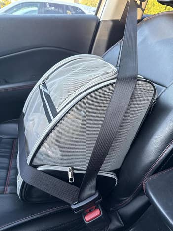 Promising review: "My dog always wanted to sit in my lap while I was driving, so I bought this so she could basically be in a bed, warm, and safe if we were to get in a car crash. There are two bands, one goes behind the seat, and the other goes on the headrest. So far, I have not had issues with it, but I don't think it could realistically withstand a high-speed collision, but it is better than her being loose in the car." —Reyna Hackmann