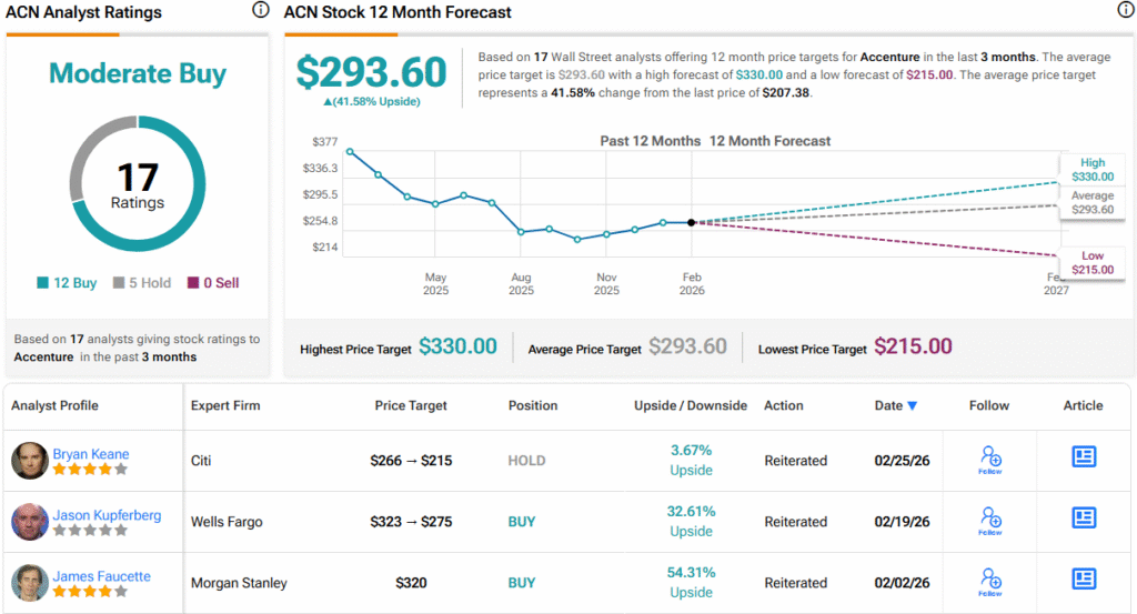 Sometimes, it seems that the markets don’t know what to do. We’re seeing gains one day, losses the next, and then more gains. The Q4 earnings have been solid, which is always good to see, and while GDP has slowed, it remains positive. We’re still waiting to see how the ripples will spread from the Supreme Court’s decision on President Trump’s tariff policies. Unlock hedge fund-level data and powerful investing tools for smarter, sharper decisions Stay ahead of the market with the latest news and analysis and maximize your portfolio's potential In all, it’s a macro picture that gives support to both the bulls and the bears – and at times like this, what investors really need is a clear sign, a signal that this stock is the one to buy, and that stock is the one to avoid. Fortunately, there are plenty of such signals to choose from. One of the best comes from the Smart Score, an AI-powered data tool from TipRanks. The Smart Score gathers and collates the volumes of raw information put out by the markets every day – and puts that information to work. It uses that data to rate every stock in the public markets – and give each one a score, based on a set of factors that is known to correlate with future outperformance. The score is set on a simple, intuitive scale of 1 to 10 – with the ‘Perfect 10’ indicating stocks that the data says are solid. It’s a good signal. And when Wall Street’s analysts are in-line with it, putting their own ‘Buy’ recommendations on Perfect 10 stocks, that is a dual signal that should definitely be more compelling to discerning investors. So let’s do just this. We’ve used the TipRanks database to pull up the details on two ‘Perfect 10’ stocks that are also getting high ratings from the analysts. Here they are. Accenture (ACN) The first ‘Perfect 10’ on today’s list is Accenture, an IT services and consulting company with a global footprint and a strong bent toward AI and data sciences. Accenture offers business and enterprise clients the services they need to reinvent the ways they remain relevant to customers. From cloud and cybersecurity to AI and data, to marketing, learning, and finance – Accenture can build all of these, and more. To do this, Accenture brings together the combined expertise of a large, worldwide workforce, over 780,000 strong, and matches it with proprietary tech platforms and assets, and deep knowledge of the full ecosystem in today’s corporate world and its combination of digital tech and business. Accenture, with its $121 billion market cap and global reach, has the resources to become the ‘reinvention partner of choice’ for some of today’s biggest business players. The company’s partners include such major names as SAP, Microsoft, AWS, Oracle, and Salesforce. The company has found great success in this approach, and that can be seen from its fiscal 2025 results. In that fiscal year, the last with full data on record, Accenture devoted $3.3 billion to ventures & acquisitions, research & development, and learning & development; in all, it was a large investment in the company’s own future. In addition, Accenture brought in $69.7 billion in annual revenue and returned $8.3 billion in cash to shareholders, mainly through its common-stock dividend. In December, Accenture reported its results for fiscal 1Q26. The company generated $18.7 billion in revenue, for a 6% year-over-year increase, and beat the forecast by over $210 million. At the bottom line, the company’s non-GAAP EPS of $3.94 was up 10% year-over-year and was 22 cents per share better than expected. Morgan Stanley’s James Faucette, in covering this stock, notes that most of any headwinds are already accounted for – and that Accenture has a sound path forward. He writes, “We think 1) market fears around potential Gen AI disruption and 2) DOGE impact are now largely baked into ACN’s current valuation at 19x FY27 EPS; further, we think M&A and ecosystem partnerships are growth levers. We believe estimates have likely bottomed and that future revisions are skewed to the upside, driven by lower interest rates and more industry clarity on AI investment path. Our growth estimates (FY26: +5%; FY27: +7% ) sit well above consensus growth figures… With a 4.5:1 Bull-Bear skew, we find ACN compelling at current valuation levels (~13% discount to S&P 500).” Faucette’s Overweight (Buy) rating comes with a $320 price target that points to a one-year gain for the stock of 54%. (To watch Faucette’s track record, click here.) Overall, these shares get a Moderate Buy rating from the Street’s analyst consensus, based on 17 reviews that include 12 Buys and 5 Holds. The stock is selling for $207.38 right now, and its $293.60 average target price implies a 41.5% upside by this time next year. (See ACN stock forecast.) Broadcom, Inc. (AVGO) Broadcom, the second ‘Perfect 10’ we’ll look at, needs little introduction. The company is one of the leading players in the valuable semiconductor industry, and, with its $1.54 trillion market cap, it has become one of the relative handful of trillion-dollar B-plus companies on Wall Street. Broadcom has built this position by being very good at what it does, and what it does is provide the leading-edge tech that makes AI work. Specifically, Broadcom is a leader in designing and producing ASIC chips, application-specific integrated circuits. These have become an essential technology in both the AI and cloud computing fields. ASICs take customer specs and bring them to life; they are made to customer-provided specifications and needs, and can bring increased efficiencies and processing speeds to the table while also improving power consumption. These attributes compensate for the chips’ higher cost, and Broadcom has a strong customer base whose high demand provides a ready market for the products. The best feature of Broadcom, from an investor’s perspective, is that the company has built