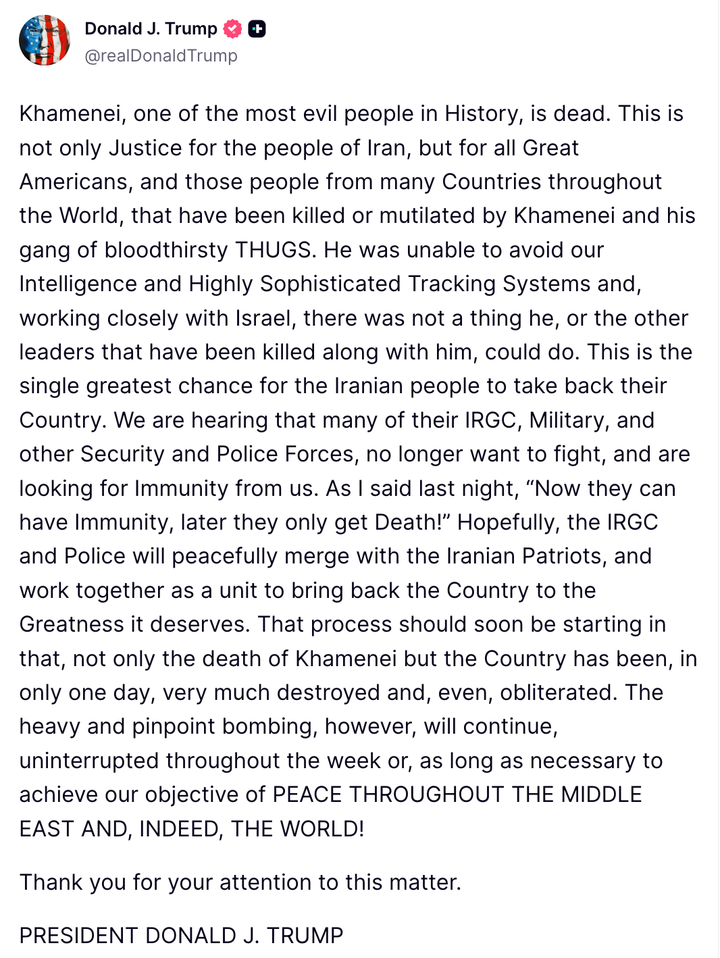 “Khamenei, one of the most evil people in History, is dead,” Trump said in a statement on Truth Social.