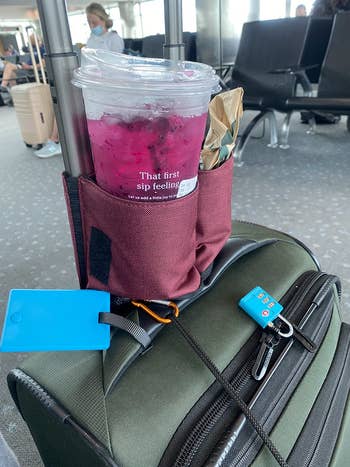 Promising review: "This cup holder is perfect! It helps me a lot! Last time, I took a plane with a suitcase and a cup of coffee, and when it was my turn to check my passport and ticket, the coffee cup fell to the ground and coffee spilled. It was a nightmare! This time, I bought this cup holder! I don't have to worry about where my cup and phone are! I can free my hands to do other things. I love it so much! Hope you love it too." —Philip
