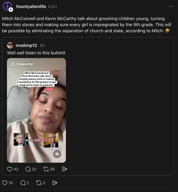 In late February 2026, internet users shared videos of people listening to an unidentified voice reading out a purported transcript of a phone call between two Republican politicians, Kentucky Sen. Mitch McConnell and former Speaker of the House Kevin McCarthy. In the call, McConnell and McCarthy allegedly discussed bringing back slavery, creating state-funded religious schools, banning abortion, stemming immigration and the forced impregnation of eighth-graders. We found no credible evidence that the transcript was authentic or that any such conversation between McConnell and McCarthy ever took place. The claim is unfounded. Videos that circulated on social media in late February 2026 showed people listening to a man's voice reading out a claimed transcript of a phone call between Kentucky Sen. Mitch McConnell and former House Speaker Kevin McCarthy. On the alleged call, McConnell and McCarthy discussed a wide range of proposed policies. One Threads user who posted a video of a woman listening to the transcript wrote (archived): Mitch McConnell and Kevin McCarthy talk about grooming children young, turning them into slaves and making sure every girl is impregnated by the 8th grade. This will be possible by eliminating the separation of church and state, according to Mitch. 🤬 (Threads user @itsonlyalienlife) The videos of people listening to the claimed transcript also circulated on Facebook (archived) and Instagram (archived). We found no evidence whatsoever that the audio clip or transcript represented an authentic conversation between McConnell and McCarthy. We found no reputable news sources reporting the "leaked" transcript (archived, archived, archived, archived), which would have been extremely newsworthy if true. Though McConnell and McCarthy both previously voted against federal protections for abortion, a common opinion for their party, neither had publicly expressed opinions or plans that aligned with the other supposed policy points like slavery and state-funded religious education allegedly discussed on the call. We reached out to representatives for McConnell and McCarthy to ask if the transcript read out in the videos was genuine and await replies to our queries. The full transcript of the alleged phone call, which an unidentified voice read out, was as follows: OK, so I got the transcripts. Mitch: We have to bring slavery back. Those were the good old days. Kevin: How will we do that, there's no way we can do that. Mitch: Black people won't do it but white people will. Kevin: How will we get white people to be slaves? That sounds ridiculous. Mitch: We have to get rid of the separation of church and state. We must have state-funded religious schools. Kevin: I don't see where you're getting at. Mitch: Those schools will have work programs for fourth through eighth graders. Kevin: Ah, I think I see where you're going here. How is that going to work? Mitch: We get the kids to be — to pick all the produce as a part of their work program to teach them the values of good, old-fashioned blue-collar labor and the bounty of God. Kevin: I don't think that anyone will go for that. Mitch: It's all about grooming, start in the first grade and by fourth grade they'll be ready to do it. Kevin: But we already have people to pick the produce. Mitch: We have to finish the wall. Kevin: No way that's going to happen. Mitch: We find better ways to get the immigrants out of the United States. Kevin: Like doubling ICE? Mitch: Yes. Kevin: This will be too busy, too hard and we'll be too busy trying to sustain this over long periods of time and generations. Mitch: No, we get rid of the abortion laws in the United States and we make it mandatory that all eighth-grade females be impregnated in order to graduate. Kevin: Oh, like replacing the crops. Ha ha ha. Pun intended. Also Kevin: I will work on getting the abortion ban, you work on state-funded religious schools. Mitch: We don't have to do either. Lindsey and I took care of that with the new SCOTUS. "Lindsey" was an apparent reference to Lindsey Graham, the senior senator from South Carolina and a fellow Republican. "SCOTUS" is a common abbreviation for the Supreme Court of the United States. The versions of the alleged phone call shared online were scant on details about when the conversation supposedly took place. Some said the recording was from July 2022, but did not back up this claim. Online postings contained no further information about who leaked the alleged call or why. As stated above, Snopes found no evidence that the alleged call between McConnell and McCarthy was real, nor did the call seem to reflect the politicians' publicly expressed opinions. McConnell and McCarthy both voted against the Women's Health Protection Act, which would "prohibit governmental restrictions on the provision of and access to abortion services." The bill passed the House in 2021 but failed in the Senate in 2022. Since then, McConnell has said that abortion should be dealt with at a state rather than a federal level. Susan B. Anthony Pro-Life America, a nonprofit that seeks to reduce and ultimately end abortion in the U.S., rated both McConnell and McCarthy "A+." Both McConnell and McCarthy have historically opposed slavery, a central theme of the alleged call, on their social media accounts. McCarthy spoke (archived) of the "evils" of slavery in 2019. That same year, McConnell wrote (archived) about "slavery's stain on our history" on X. However, McConnell did previously oppose the idea of reparations for slavery, saying in 2019 he didn't think "reparations for something that happened 150 years ago, for whom none of us currently living are responsible, is a good idea." Lastly, McConnell allegedly advocated for "state funded religious schools" in the phone call transcript. These schools, he allegedly argued, would be the basis for the renewed slavery project, as students would participate in work programs. In reality, McConnell has historically been a