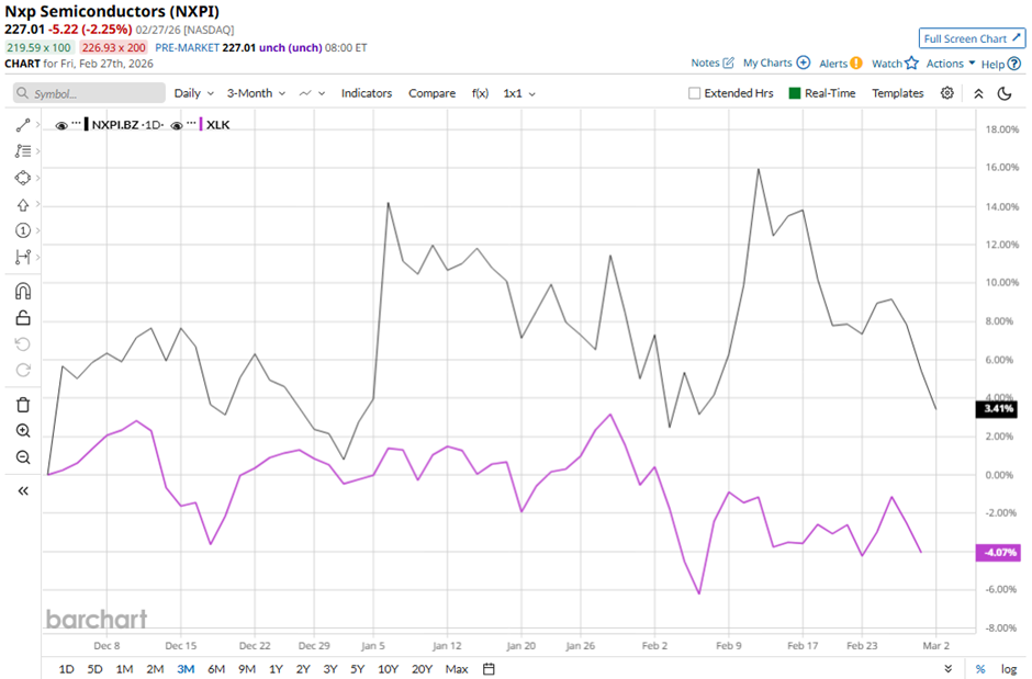 With a market cap of $57.4 billion, NXP Semiconductors N.V. (NXPI) is a global semiconductor company that designs and supplies a wide range of advanced chip solutions across the United States, Europe, and Asia. Headquartered in Eindhoven, the Netherlands, it sells its products through direct sales offices and independent distributors worldwide. Companies valued at $10 billion or more are generally considered “large-cap” stocks, and NXP Semiconductors fits this criterion perfectly. Its product portfolio includes microcontrollers, application and communication processors, wireless connectivity solutions, analog and interface products, RF devices, security controllers, and environmental and inertial sensors. These technologies support key markets such as automotive, industrial and Internet of Things, mobile devices, and communication infrastructure. Nvidia Stock May Be Oversold - What is the Best NVDA Play? Jobs, Geopolitics and Other Key Things to Watch this Week As Coinbase Rolls out 24/5 Stock Trading, Should You Snap up COIN? Markets move fast. Keep up by reading our FREE midday Barchart Brief newsletter for exclusive charts, analysis, and headlines. The chipmaker's stock has dipped 11.5% from its 52-week high of $256.36. Over the past three months, shares of NXPI have soared 17.2%, which outpaced the State Street Technology Select Sector SPDR ETF's (XLK) decline of 2.2% during the same period. NXPI stock has risen 4.6% on a YTD basis, outperforming XLK’s 3.6% decrease. However, in the longer term, shares of NXP Semiconductors have gained 4.7% over the past 52 weeks, lagging behind XLK’s 24.7% gain over the same time frame. Despite a few fluctuations, NXPI stock has been trading above its 50-day and 200-day moving averages since December 2025. Shares of NXPI fell 4.5% following its Q4 2025 results on Feb. 2 as investors reacted to a softer-than-expected Q1 2026 outlook, with revenue guided at a midpoint of $3.15 billion, implying a 6% sequential decline. The decline was compounded by deterioration in GAAP profitability, as Q4 operating margin fell to 22.3%, while EPS dropped 28% quarter-on-quarter to $1.79. Sentiment was further pressured by sluggish full-year performance, with 2025 revenue down 3% year-on-year to $12.27 billion and continued weakness in Communications Infrastructure, which declined 18% year-on-year in Q4. In comparison, rival Microchip Technology Incorporated (MCHP) has outpaced NXPI stock. MCHP stock has returned 17.1% on a YTD basis and 30.7% over the past 52 weeks. Despite the stock’s underperformance relative to the sector over the past year, analysts are strongly optimistic about its prospects. NXPI stock has a consensus rating of “Strong Buy” from the 30 analysts covering the stock, and the mean price target of $259.67 is a premium of 14.4% to current levels. On the date of publication, Sohini Mondal did not have (either directly or indirectly) positions in any of the securities mentioned in this article. All information and data in this article is solely for informational purposes. This article was originally published on Barchart.com