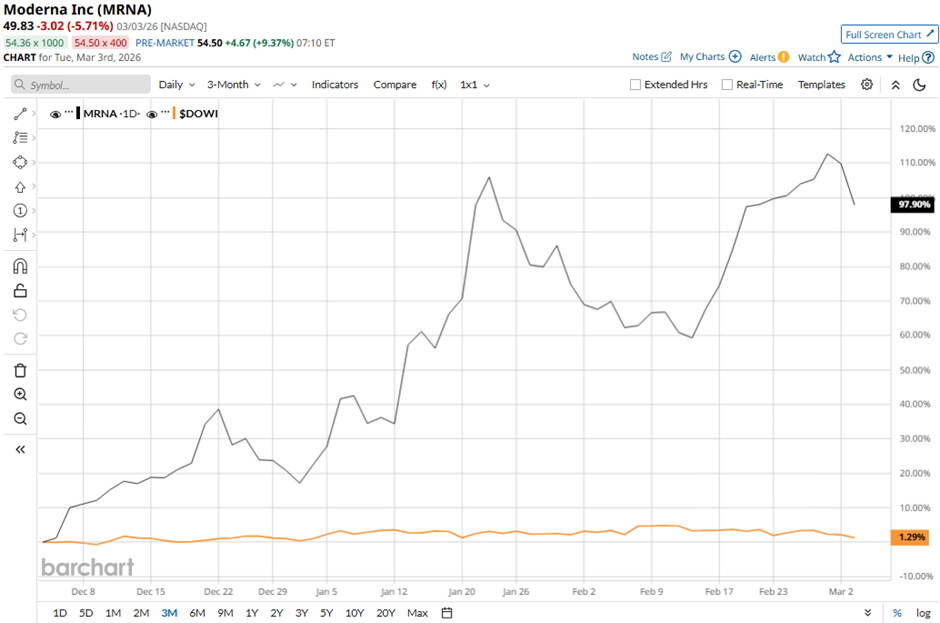 With a market cap of $19.7 billion, Moderna, Inc. (MRNA) is a biotechnology company specializing in messenger RNA (mRNA) medicines, with operations across the United States, Europe, and global markets. Its broad vaccine portfolio spans respiratory diseases (including COVID-19, RSV, influenza, and pandemic influenza), latent and enteric viruses, public health threats such as Zika and Mpox, and bacterial diseases like Lyme disease. Companies valued at $10 billion or more are generally considered "large-cap" stocks and Moderna fits this criterion perfectly. Moderna also develops oncology therapeutics ranging from cancer vaccines to T-cell engagers, as well as treatments for rare diseases, including cystic fibrosis and metabolic disorders. Dear Costco Stock Fans, Mark Your Calendars for March 5 SanDisk Stock Forecast: Can the Rally Continue Into 2026? Dear Broadcom Stock Fans, Mark Your Calendars for March 4 Our exclusive Barchart Brief newsletter is your FREE midday guide to what's moving stocks, sectors, and investor sentiment - delivered right when you need the info most. Subscribe today! Shares of the Cambridge, Massachusetts-based company have slipped 9.7% from its 52-week high of $55.20. MRNA stock has climbed 97.9% over the past three months, surpassing the broader Dow Jones Industrials Average's ($DOWI) 1.3% rise over the same time frame. MRNA stock is up 69% on a YTD basis, exceeding DOWI's marginal gain. Longer term, shares of Moderna have surged 64.6% over the past 52 weeks, compared to Dow Jones' 12.3% return over the same time frame. The stock has shown a bullish trend, trading above its 50-day and 200-day moving averages since December 2025. Shares of Moderna soared 5.3% on Feb. 13 after the company reported Q4 2025 revenue of $678 million, beating expectations, and a narrower net loss of $826 million compared with a $1.1 billion loss a year earlier. Investors also reacted positively to Moderna reiterating its 2026 outlook of up to 10% revenue growth, alongside sharply reduced operating expenses, including a 31% year-over-year drop in R&D spending in Q4. The rally was further supported by pipeline progress, notably full enrollment of a Phase 3 norovirus vaccine trial with data expected in 2026 and full enrollment of the Phase 2 intismeran autogene bladder cancer trial. In comparison, its rival Eli Lilly and Company (LLY) has lagged behind MRNA stock. LLY stock has declined 6.2% on a YTD basis and gained 8.4% over the past year. Despite MRNA's outperformance relative to the Dow over the past year, analysts are cautious about its prospects. The stock has a consensus “Hold” rating overall from the 24 analysts covering the stock. As of writing, the stock is trading above the mean price target of $40.95. On the date of publication, Sohini Mondal did not have (either directly or indirectly) positions in any of the securities mentioned in this article. All information and data in this article is solely for informational purposes. This article was originally published on Barchart.com