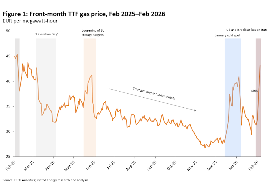 Military strikes in the Middle East and the effective closure of the Strait of Hormuz have triggered one of the sharpest moves in European gas markets over the past year, with the Title Transfer Facility (TTF) benchmark surging on disrupted liquefied natural gas (LNG) flows. The shock is transmitting directly into European power markets, with price reactions varying according to national gas exposure. Beyond the immediate volatility, the market reaction underscores the structural linkage between global LNG supply, European electricity pricing and Europe’s broader energy security trajectory. This escalation in conflict strengthens the structural case for accelerating the energy transition. Strait of Hormuz closure tightens global LNG balance Following US and Israeli strikes on Iran over the weekend and retaliatory moves by the Islamic Republic, global gas markets adjusted sharply. The disruption of Qatari LNG output and the effective closure of the Strait of Hormuz represent a tangible tightening of the global LNG balance. The reaction is visible in movements in the Netherlands-based TTF benchmark, highlighted in Figure 1 below. By market close on 2 March, the TTF was up 36% from pre-weekend levels, having traded nearly 50% higher during the day. The magnitude of the move places it among the largest single-session adjustments of the past year. Impact on European power markets The move in gas prices does not remain confined to commodity markets; it transmits directly into European wholesale electricity pricing through the market’s price formation mechanism. Related: Magnet Wars: How the U.S. Plans to Break China’s Grip on Rare Earths As illustrated in Figure 2 below, German wholesale power prices – used here as a proxy for broader European dynamics – closely track the cost of gas-fired generation. The relationship reflects the central role of gas in marginal price formation. The cost of gas generation in Europe is closely linked to the TTF benchmark, which itself is anchored to global LNG supply and demand conditions. Transmission varies with power mix The degree of link depends on the structural role of gas in each national power system. As shown in Figure 3 below, gas accounted for around 41% of power generation in Italy last year, 35% in the UK, 13% in Germany, and just 3% in France. Where gas represents a larger share of generation, it more frequently sets the marginal price and therefore embeds movements in the TTF directly into wholesale electricity prices. This structural relationship is reflected in forward price movements at market close on 2 March (Figure 4). The UK’s front-month contract was up 19.5%, while Italy’s was up 13.5% and Germany’s up 7.4%. The magnitude of the reaction broadly follows the relative gas intensity of each system. The UK and Italy, where gas plays a dominant role in marginal price formation, recorded the strongest upward adjustments. Germany, with a lower but still material gas share, saw a more moderate move. Related: The U.S. Just Took a Giant Step in The Rare Earth Race With China France, by contrast, declined 14% at 2nd of March market close. With gas accounting for only a small fraction of the country’s generation mix, direct transmission from the TTF into French wholesale prices is structurally limited. The negative move therefore suggests market-specific dynamics – including liquidity conditions and positioning – played a larger role than gas fundamentals in shaping the short-term reaction. Ongoing volatility reinforces gas-linked transmission Since the 2 March market close, volatility has intensified. In early afternoon trading on 3 March, the TTF front-month contract was a further 28% higher relative to the previous day’s settlement, trading around €57 ($66) per megawatt-hour (MWh). The move underscores that the market continues to reassess available LNG supply under highly uncertain conditions. Power markets are adjusting accordingly. Germany’s front-month contract is up approximately 31% as of the early afternoon on 3 March, with Italy’s up around 20%, while France has rebounded about 16%. The reversal in France suggests that part of the 2 March decline likely reflected short-term positioning dynamics rather than structural fundamentals. Taken together, the latest moves reinforce rather than contradict the core mechanism outlined above: systems with greater gas exposure are exhibiting stronger and more immediate sensitivity to movements in the TTF benchmark. In an environment of elevated uncertainty, price discovery remains highly reactive. Energy security and structural implications If conflict persists and the supply disruption proves durable, the implications extend beyond short-term volatility. Higher TTF levels lift forward power curves, particularly in gas-exposed markets, strengthening renewable project economics through improved capture prices and revenue expectations. More fundamentally, the war in the Middle East is likely to shift the policy lens back towards energy security. The sharp move in gas and power markets following the strikes over the weekend and this week highlights that Europe’s structural vulnerability lies in continued dependence on imported fossil fuels exposed to geopolitical risk. By Rystad Energy More Top Reads From Oilprice.com European Gas Prices Soar 30% as Qatar Halts LNG Output Pakistan-Afghanistan Conflict Halts Critical Central Asian Trade Routes Middle East Conflict Poised to Benefit U.S. Chemical Manufacturers Oilprice Intelligence brings you the signals before they become front-page news. This is the same expert analysis read by veteran traders and political advisors. Get it free, twice a week, and you'll always know why the market is moving before everyone else. You get the geopolitical intelligence, the hidden inventory data, and the market whispers that move billions - and we'll send you $389 in premium energy intelligence, on us, just for subscribing. Join 400,000+ read