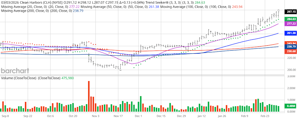 Clean Harbors (CLH) is up more than 45% over the past year. Shares are trading at new all-time highs and have robust technical momentum. CLH maintains a 100% “Buy” Barchart opinion. Analyst sentiment is bullish with price targets up to $412, although Morningstar sees CLH as 9% overvalued at current levels. Valued at $15.72 billion, Clean Harbors (CLH) is a leading provider of environmental, energy, and industrial services in North America. It operates the largest number of hazardous waste incinerators, landfills and treatment, storage and disposal facilities. Clean Harbors provides a broad range of services such as end-to-end hazardous waste management, emergency response, industrial cleaning and maintenance, and recycling services. The company is also the largest re-refiner and recycler of used oil globally and the leading provider of parts washers and environmental services to commercial, industrial and automotive customers in North America. Dear Costco Stock Fans, Mark Your Calendars for March 5 SanDisk Stock Forecast: Can the Rally Continue Into 2026? Dear Broadcom Stock Fans, Mark Your Calendars for March 4 Our exclusive Barchart Brief newsletter is your FREE midday guide to what's moving stocks, sectors, and investor sentiment - delivered right when you need the info most. Subscribe today! I found today’s Chart of the Day by using Barchart’s powerful screening functions to sort for stocks with the highest technical buy signals; superior current momentum in both strength and direction; and a Trend Seeker “buy” signal. I then used Barchart’s Flipcharts feature to review the charts for consistent price appreciation. CLH checks those boxes. Since the Trend Seeker issued a new “Buy” on Dec. 2, shares are up 22.85%. Editor’s Note: The technical indicators below are updated live during the session every 20 minutes and can therefore change each day as the market fluctuates. The indicator numbers shown below therefore may not match what you see live on the Barchart.com website when you read this report. These technical indicators form the Barchart Opinion on a particular stock. Clean Harbors scored an all-time high of $298.12 on March 3. Clean Harbors has a Weighted Alpha of +53.61. CLH has an 100% “Buy” opinion from Barchart. The stock has gained 45.69% over the past 52 weeks. Clean Harbors has its Trend Seeker “Buy” signal intact. The stock recently traded at $293.89 with a 50-day moving average of $262.48. CLH has made 11 new highs and is up 12.38% over the past month. Relative Strength Index (RSI) is at 70.84. There’s a technical support level around $290.11. $15.72 billion market capitalization. 40.8x trailing price-earnings ratio. Revenue is expected to grow 3.14% this year and another 4.54% next year. Earnings are estimated to increase 11.53% this year and an additional 13.04% next year. The Wall Street analysts followed by Barchart gave the stock 7 “Strong Buy,” 1 “Moderate Buy,” and 6 “Hold” opinions with price targets between $240 and $320. Value Line rates the stock “Highest” with price targets between $221 and $412 with a midpoint of $316. CFRA’s MarketScope rates the stock a “Buy” with a price target of $315. Morningstar thinks the stock is 9% overvalued with a fair value of $270.56. 798 investors following the stock on Motley Fool think it will beat the market while 114 think it won’t. 6,890 investors are following the stock on Seeking Alpha, which rates it a “Hold.” Short interest is 2.01% of the float with 2.21 days to cover the float. Value Line, analysts, and individual investors are still bullish, and Clean Harbors’ valuation is not stretched that much. Additional disclosure: The Barchart Chart of the Day highlights stocks that are experiencing exceptional current price appreciation. They are not intended to be buy recommendations as these stocks are extremely volatile and speculative. Should you decide to add one of these stocks to your investment portfolio it is highly suggested you follow a predetermined diversification and moving stop loss discipline that is consistent with your personal investment risk tolerance. On the date of publication, Jim Van Meerten did not have (either directly or indirectly) positions in any of the securities mentioned in this article. All information and data in this article is solely for informational purposes. This article was originally published on Barchart.com