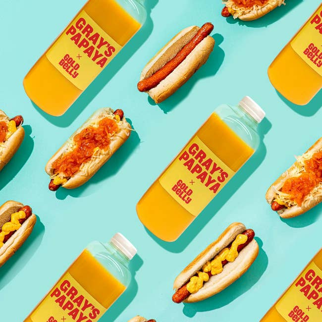 The set comes with skinned all-beef hot dogs, sauerkraut, onions in sauce, spicy mustard, locally-baked buns, and Gray’s signature frothy Papaya Drink.