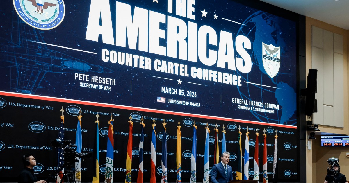 At the inaugural ‘Americas Counter Cartel Conference’, Trump officials pledged to continue military operations against Latin American gangs. Share Save The United States-Israeli war with Iran continues to rage, as Washington pledges to send more troops and military assets to the Middle East and Tehran widens its retaliatory strikes across the region. But on Thursday, top officials under US President Donald Trump shifted focus to another military front: Latin America. Since taking office for a second term, Trump has indicated he plans to exert US dominance over the entire Western Hemisphere. His push for control has coincided with military operations against alleged criminal networks across the region. At Thursday’s inaugural “Americas Counter Cartel Conference”, speakers such as White House security adviser Stephen Miller assured reporters that Latin America would remain a top military priority for the US, regardless of events in the Middle East. “We are not going to cede an inch of territory in this hemisphere to our enemies or adversaries,” Miller said, adding the US was “using hard power, military power, lethal force, to protect and defend the American homeland”. Miller further maintained there is no “criminal justice solution” to drug cartels, which he likened to armed groups like al-Qaeda and ISIL (ISIS). Organised crime, he concluded, “can only be defeated with military power”. Since Trump took office last year, his administration has applied what experts describe as a “global war on terror” approach to Latin America, including by labelling drug cartels “foreign terrorist organisations”. Figures like Miller, a key architect behind Trump’s hardline immigration policies, have championed the president’s militaristic approach, even as critics warn it raises human rights and legal concerns. Last September, for instance, the administration began striking alleged drug-smuggling boats in the Caribbean and eastern Pacific Ocean, in what rights groups have decried as extrajudicial killings. And in early January, the US launched an extraordinary operation to abduct Venezuelan leader Nicolas Maduro. It has since pursued a pressure campaign against Cuba designed to weaken its communist government. Just this week, on Wednesday, the Pentagon announced it had launched joint operations with Ecuador’s military “against Designated Terrorist Organizations” in the South American country. The announcement indicated a new front for US military actions in the region, which officials have said could include land operations. But the broadening scope of Trump’s military involvement in Latin America, combined with the nascent war with Iran, has raised questions about the US’s ability to sustain such intense military activity. The “Americas Counter Cartel Conference” came as Latin American leaders arrived in South Florida to attend a regional summit hosted by Trump at his Mar-a-Lago estate. Attendees included officials from the Trump-allied conservative governments in Argentina, Honduras and the Dominican Republic. But despite support from several regional governments, Secretary of Defence Pete Hegseth nevertheless told the audience that the US was “prepared to take on” Latin America’s cartels and “go on the offence alone, if necessary”. “However, it is our preference — and it is the goal of this conference — that, in the interest of this neighbourhood, we all do it together,” Hegseth added. The secretary also praised Trump’s take on the 1823 Monroe Doctrine, which sought to establish a US sphere of influence, separate from Europe, in the Western Hemisphere. Administration officials have dubbed Trump’s parallel approach the “Donroe doctrine”. Hegseth framed the administration’s attacks on alleged drug-smuggling boats as a keystone of Trump’s effort to maintain regional influence. The US military has carried out at least 44 aerial strikes on vessels in the Caribbean Sea and eastern Pacific Ocean, resulting in an estimated 150 known deaths. The identities of the victims have not been released, with several family members saying fishermen and informal workers were among those targeted. The Pentagon chief said the approach was meant to “establish deterrence”. “If the consequence was simply to be arrested and then released, well, that’s a consequence they’d already priced in a long time ago,” Hegseth said. He then pointed to a “few weeks” in February in which there were no strikes on alleged drug boats. The pause in attacks, he said, was evidence of the strategy’s success. But that break notably came as the US surged assets to the Middle East. Neither Hegseth nor Miller specifically referred to the war with Iran, but the pair touched on themes that have been present in the administration’s messaging on the war. Trump, for example, said Iran’s government “waged war against civilisation itself”. There have been reports, meanwhile, that US military officials have referenced the biblical “end times” as a religious underpinning for the war. Those remarks have reflected what critics consider Trump’s embrace of Christian nationalism and his view of the Americas as a European-derived “civilisation” threatened by outside forces. At Thursday’s conference, Miller himself referenced violence in European history as justification for the modern-day military actions in Latin America. There were periods in European history throughout the 18th and 19th centuries during which “ruthless means were used to get rid of the people who were raping and murdering and defying established systems of order and justice,” Miller said. He also echoed Trump’s allegation that Europe was facing “civilisational erasure” as a result of left-wing leadership and immigration. “The reason why many Western countries are struggling today is they’ve forgotten the eternal truth and wisdoms they once followed,” Miller said. He