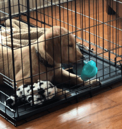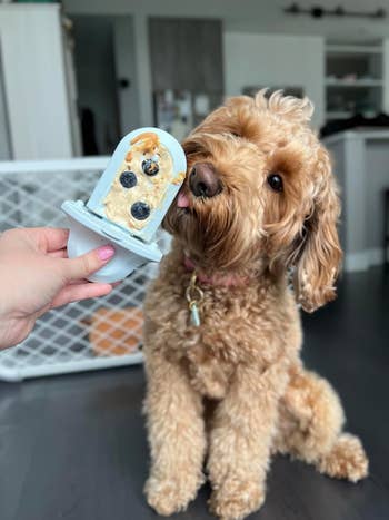 Promising review: "Our puppy loves this! We used it to lure her into her crate and [make her] comfortable spending time in there. The licking is self-soothing, and it is great to have something cold for her sore mouth while she is teething. She hasn’t been biting or chewing on it, but having something cold has stopped her from chewing up other items! We are also in a humid climate where the average temperatures have been in the high 90s and low 100s, so having something cold to cool her off really helps. We purchased other similar items (like lick mats), but they have not worked nearly as well, and they don’t have a cover! The cover is key to being able to freeze this and keep it clean between uses." —LadyTodd