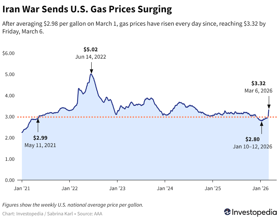 Gas prices have risen across the U.S. this week as oil prices have jumped amid a widening Middle East conflict that threatens supplies. The national average now stands at $3.32, with Kansas and Oklahoma the cheapest and California, Washington, and Hawaii in the mid- to upper-$4 range. After falling below $3 in December for the first time since 2021, the national average stayed there for about 13 weeks before surging this week. Oil prices have climbed steeply as the Iran war fuels fears of supply disruptions, and the impact has quickly shown up at the pump. The national average for regular gas has surged 34 cents a gallon in five days, rising from $2.98 on Sunday to $3.32 by Friday. Prices first rose above $3.00 on Monday after holding below that level for 13 straight weeks—the first sustained stretch under $3 since 2021. Since then, the national average has climbed each day as the Middle East conflict escalates and oil prices rise. Because gasoline prices tend to track crude, the rally in energy markets has quickly filtered through to drivers. Gas prices are jumping higher, which could affect commuting and travel budgets if the trend continues. Still, what you pay depends heavily on your state—and the gap can be as much as $2 per gallon. Gas prices vary sharply depending on where you live. While the national average has climbed this week, state-level prices still span a wide range across the country. As of March 6, drivers in Kansas, Oklahoma, Mississippi, and Tennessee are paying some of the lowest averages in the nation, all below $2.90 per gallon, according to AAA. At the other end of the spectrum, California, Washington, Hawaii, and Oregon all have statewide averages above $4.00. California is the highest at $4.91 per gallon, which is $2 more than what drivers are paying in some of the cheapest states. Western states typically see higher prices because of fuel taxes, environmental regulations, and supply constraints. With oil prices rising amid the Iran war, those regional differences are now layered on top of broader upward pressure at the pump. The national average briefly topped $5 per gallon in June 2022. Amid this week's surge, California’s average is approaching that mark—though most states still have averages in the $3 range. The differences can be striking. A driver in Kansas could pay $2 less per gallon than someone filling up in California. But that wide spread isn’t random—it reflects structural differences in how gasoline is taxed, produced, and delivered across the country. Fuel taxes are one of the biggest reasons prices vary by state, according to the U.S. Energy Information Administration. In 2023, federal and state taxes accounted for more than 14% of the average price per gallon. Because some states add far more in taxes and fees than others, those differences show up clearly at the pump. Prices also depend on proximity to refineries and pipelines, as well as whether a state requires special fuel blends that cost more to produce. California, for example, mandates a unique, cleaner-burning gasoline blend that relatively few refineries produce. The state also has one of the highest gasoline taxes in the country. Read the original article on Investopedia