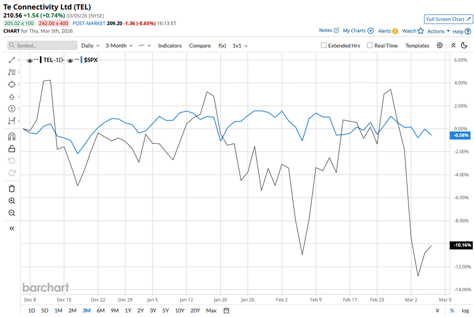 Ballybrit, Ireland-based TE Connectivity plc (TEL) manufactures and sells connectivity and sensor solutions in the Americas and internationally. The company has a market capitalization of $61.3 billion and operates through the Transportation Solutions and Industrial Solutions segments. TEL’s offerings include antennas, application tooling, cable assemblies, connectors, electromagnetic compatibility/electromagnetic interference solutions, and more. Companies with a market cap of $10 billion or more are typically referred to as “large-cap stocks.” TEL fits right into that category, with its market cap exceeding this threshold, reflecting its substantial size and influence in the electronic components industry. Dear Raytheon Stock Fans, Mark Your Calendars for March 6 Stocks Slip Before the Open as Bond Yields Climb on Inflation Worries, U.S. Economic Data on Tap Target Profits Between $165 and $175 with a Broken Wing Butterfly on Nvidia Stock Markets move fast. Keep up by reading our FREE midday Barchart Brief newsletter for exclusive charts, analysis, and headlines. The stock touched its 52-week high of $250.67 on Nov. 05, 2025, and is currently trading 16% below that peak. TEL stock has declined 10.2% over the past three months, underperforming the S&P 500 Index’s ($SPX) marginal decline during the same time frame. However, TE Connectivity has rallied the broader market over the longer term. The stock surged 39.7% over the past 52 weeks, while SPX delivered 16.9% returns over the same time frame. For most of the past year, TEL stock comfortably traded above its 50-day and 200-day moving averages, signaling steady strength. But recently, the momentum cooled a bit, with TEL slipping below those key levels. On Jan. 22, TEL shares grew marginally following the release of its better-than-expected Q1 2026 earnings. The company’s net sales grew 22% year-over-year to $4.7 billion, driven by growth in both the Industrial and Transportation segments, and surpassed the Street’s estimates. Moreover, TEL’s adjusted EPS for the quarter amounted to $2.72, also coming in at the top of Wall Street estimates. When stacked against its peer, Corning Incorporated (GLW), TEL has underperformed. Over the past year, GLW stock has climbed 186.4%, outperforming TEL stock. Wall Street’s sentiment on TEL remains very positive. Among the 18 analysts covering the stock, the consensus rating is a “Strong Buy.” Its mean price target of $268.33 suggests a 27.4% upside potential from current price levels. On the date of publication, Sristi Jayaswal did not have (either directly or indirectly) positions in any of the securities mentioned in this article. All information and data in this article is solely for informational purposes. This article was originally published on Barchart.com