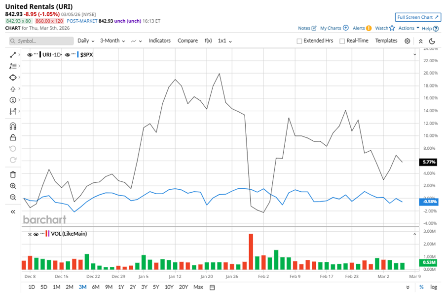 United Rentals, Inc. (URI), headquartered in Stamford, Connecticut, functions as an equipment rental company. Valued at $53.7 billion by market cap, the company offers a wide range of construction and industrial equipment for rent, sale, and servicing, including general and specialized machinery, tools, safety gear, storage solutions, power and climate control systems, and repair and maintenance services. Companies worth $10 billion or more are generally described as “large-cap stocks,” and URI perfectly fits that description, with its market cap exceeding this mark, underscoring its size, influence, and dominance within the rental & leasing services industry. URI's global market leadership and extensive fleet drive its strong brand recognition. The company's proprietary software, Total Control®, and digital capabilities enhance customer relationships and operational efficiency. Dear Raytheon Stock Fans, Mark Your Calendars for March 6 Target Profits Between $165 and $175 with a Broken Wing Butterfly on Nvidia Stock Stocks Slip Before the Open as Bond Yields Climb on Inflation Worries, U.S. Economic Data on Tap Tired of missing midday reversals? The FREE Barchart Brief newsletter keeps you in the know. Sign up now! Despite its notable strength, URI slipped 17.5% from its 52-week high of $1,021.47, achieved on Oct. 16, 2025. Over the past three months, URI stock gained 5.8%, outperforming the S&P 500 Index’s ($SPX) marginal decline during the same time frame. Shares of URI rose 4.2% on a YTD basis and climbed 33% over the past 52 weeks, outperforming SPX’s YTD marginal losses and 16.9% returns over the last year. To confirm the recent bearish trend, URI has been trading below its 50-day and 200-day moving averages since late February. United Rentals' growth in specialty businesses and large projects was offset by margin compression from repositioning costs and project delays. The company added 60 new locations and expects strong project pipelines in infrastructure and tech, but delivery costs and delayed projects weighed on margins. On Jan. 28, URI reported its Q4 results, and its shares closed down by 12.9% in the following trading session. Its adjusted EPS of $11.09 missed Wall Street expectations of $11.90. The company’s revenue was $4.2 billion, falling short of Wall Street forecasts of $4.3 billion. URI expects full-year revenue in the range of $16.8 billion to $17.3 billion. URI’s rival, Herc Holdings Inc. (HRI) shares have lagged behind the stock, with an 11.2% downtick on a YTD basis and 1.3% losses over the past 52 weeks. Wall Street analysts are reasonably bullish on URI’s prospects. The stock has a consensus “Moderate Buy” rating from the 21 analysts covering it, and the mean price target of $942 suggests a potential upside of 11.8% from current price levels. On the date of publication, Neha Panjwani did not have (either directly or indirectly) positions in any of the securities mentioned in this article. All information and data in this article is solely for informational purposes. This article was originally published on Barchart.com