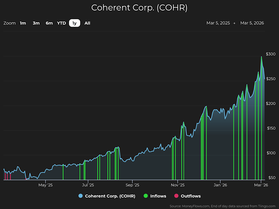 COHR develops, manufactures, and sells engineered materials, opto-electronic components and devices, as well as lasers for industrial, communications, electronics, and instrumentation customers. The company’s second-quarter fiscal 2026 earnings report showed revenue of $1.69 billion (a 17.4% year-over-year gain), non-GAAP per-share earnings of $1.29 (up from $1.16 the prior period), and guidance of up to $1.84 billion in revenue and EPS hitting $1.48. It’s no wonder COHR shares are up 38% so far this year – and they could rise more. MoneyFlows data shows how Big Money investors are again betting heavily on the stock. Institutional volumes reveal plenty. In the last year, COHR has enjoyed strong investor demand, which we believe to be institutional support. Each green bar signals unusually large volumes in COHR shares. They reflect our proprietary inflow signal, pushing the stock higher: Plenty of technology names are under accumulation right now. But there’s a powerful fundamental story happening with Coherent. Institutional support and a healthy fundamental backdrop make this company worth investigating. As you can see, COHR has had strong sales growth: 1-year sales growth rate (+23.4%) 3-year sales growth rate (+23.4%) Source: FactSet Also, EPS is estimated to ramp higher this year by +39.1%. Now it makes sense why the stock has been generating Big Money interest. COHR has a track record of strong financial performance. Marrying great fundamentals with MoneyFlows software has found some big winning stocks over the long term. Coherent has been a top-rated stock at MoneyFlows. That means the stock has unusual buy pressure and growing fundamentals. We have a ranking process that showcases stocks like this on a weekly basis. COHR has gained 539% since its first appearance on the rare Outlier 20 report in 2017. In just the last year, COHR has drawn six outlier inflow signals. The blue bars below show when COHR was a top pick…huge inflows are pushing shares higher: Tracking unusual volumes reveals the power of money flows. This is a trait that most outlier stocks exhibit…the best of the best. Big Money demand drives stocks upward. The COHR action isn’t new at all. Big Money buying in the shares is signaling to take notice. Given the historical gains in share price and strong fundamentals, this stock could be worth a spot in a diversified portfolio. Disclosure: the author holds no position in COHR at the time of publication. If you are a Registered Investment Advisor (RIA) or are a serious investor, take your investing to the next level and follow our free weekly MoneyFlows insights. This article was originally posted on FX Empire Brent Crude Oil Analysis: $95 Target Reinforced, Double Bottom Intact Semiconductor Opportunity Is Here Further Strength for the Australian Dollar After Higher Inflation See How Institutions Push Vita Coco Shares Higher The Clear Reasons for Coherent’s Rise Walmart Earnings Preview: Can WMT Reach a New All-Time High? (Part One)