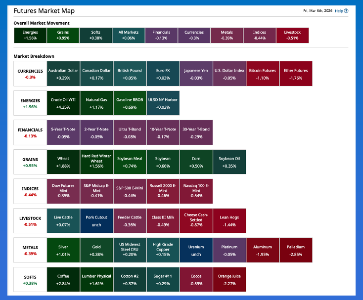 Early Friday morning finds the commodity complex with a similar look to what we saw Thursday morning when Fear Of Inflation Long-term (F.O.I.L.) pulled markets higher. Gold and silver were showing gains pre-dawn, not surprising ahead of another uncertain weekend. The recent strength of distillates (heating oil, diesel fuel, etc.) has helped spark a strong rally in soybean oil which in turn has brought steady fund buying to soybeans. Morning Summary: If you liked Thursday’s session, then you’ll also get a kick out of what the quote screen has to show you early Friday morning. A quick glance at the Barchart Futures Market Heat Map shows Energies, Grains, and Softs leading the way higher while Metals and US stock index futures (Indices) are lower once again. As I talked about in yesterday’s Afternoon Commentary, all the pieces seem to be in place indicating a simple case of F.O.I.L. (Fear Of Inflation Long-term). It’s an understandable feeling as the Strait of Hormuz remains shut down, for the most part. It’s interesting to note the largest benefactor of the US action in Iran has been Russia, as buyers from around the world head toward the largest supplier of cheap oil. But then again, is anyone really surprised by this? Anyone? Bueller? Speaking of Energies, one of the small differences I see this morning is the spot-month distillates contract ((HOJ26) was showing a slight shade of red while the rest of the market was green again. Also, gold and silver were higher to start the day after crumbling during Thursday’s session. It would not be surprising to see these two key metals find increased buying interest heading into another uncertain weekend. Soybeans: As for the soybean market, it was a case of Same Story, Different Day early Friday morning. The May issue added as much as 9.25 cents overnight on trade volume 21,000 contracts and was sitting 7.25 cents higher pre-dawn. There are a couple points of interest in this runaway train: First, the National Index (ZSPAUS.CM) came in near $11.0550 Thursday night, up about 9.75 cents and keeping the national average basis calculation near 73.75 cents under May futures. While merchandisers didn’t back away from the ongoing rally in the futures market, the basis market remains weak as it continues to run below the previous 5-year and 10-year averages. The latest weekly export sales and shipments update showed the US was on pace to ship 1.234 billion bushels (a fun number) as of Thursday, February 26, a point in the marketing year when the US has shipped an average 78% of what turns out to be total exports. Total commitments to China continue to run about 50% below the same week last year. The second point of interest will be this afternoon’s weekly Commitments of Traders report (legacy, futures only) to see if funds have pushed their net-long futures position beyond last fall’s peak of 254,090 contracts. What Does the Middle East Conflict Mean for Valero Energy Stock? Nat-Gas Prices Rally on a Larger-Than-Expected Fall in Inventories Crude Oil Prices Surge as Iran War Upends Global Crude Flows Stop Missing Market Moves: Get the FREE Barchart Brief – your midday dose of stock movers, trending sectors, and actionable trade ideas, delivered right to your inbox. Sign Up Now! Corn: The corn market was higher early Friday morning on an uptick in overnight trade volume. My Blink[i] reaction is King Corn continues to be pulled higher by soybeans, which itself is being led by soybean oil, which in turn owes the incredible rally in distillates for its recent spike. In other words, corn doesn’t have a fundamental reason to be going up, but it is anyway, and as Market Rule #1 tells us, don’t get crossways with the trend. The May issue (ZCK26) gained as much as 2.75 cents overnight and was sitting one tick off its session high at this writing on trade volume of 36,000 contracts. Thursday evening saw the National Price Index come in near $4.1175, putting national average basis at roughly 41.75 cents under May futures. This is in line with last year’s calculation for this same week at about 41.0 cents under May. I’ll be keeping an eye on the May-July futures spread as Friday progresses to see if it posts another low daily close. The previous mark is 9.75 cents carry from this past Wednesday. The spread closed Thursday at 9.25 cents and covered a still neutral 45% calculated full commercial carry. Last year, the 2025 spread covered 30% this week. Wheat: It was more of the same in the wheat sub-sector pre-dawn Friday with all three markets showing solid gains. Has wheat suddenly and miraculously turned fundamentally bullish? No, but it doesn’t matter at this time. As the old saying goes, “A rising tide lifts all boats”, until the holes in some of those vessels cause them to sink again. And the hole in the two winter wheat markets continues to be bearish long-term supply and demand. Turning the spotlight on new-crop markets we see July HRW (KEN26) is up another 8.25 cents at this writing, extending the uptrend on its weekly chart to a high of $6.1625, the highest price for a July HRW issue since the week of March 17, 2025. Thursday saw the July-September futures spread close at a carry of 14.25 cents and cover 63% calculated full commercial carry with the September-December covering 59%. Both are still leaning bearish. Over in SRW we see July (ZWN26) up 8.75 cents after adding as much as 12.0 cents overnight. Here the new-crop futures spreads covered a bearish 73% and 71%, based on the lower storage rate set to go into effect on March 19. We’ll see how new-crop markets finish the week given rains moving across the Plains and Midwest. [i] Based on the Malcolm Gladwell book Blink, the theme being our initial thought is usually right before we spend time talking ourselves out of the decision. On the date of publication, Darin Newsom did not have (either directly or indirectly) positions in any of the securities mentioned in this arti