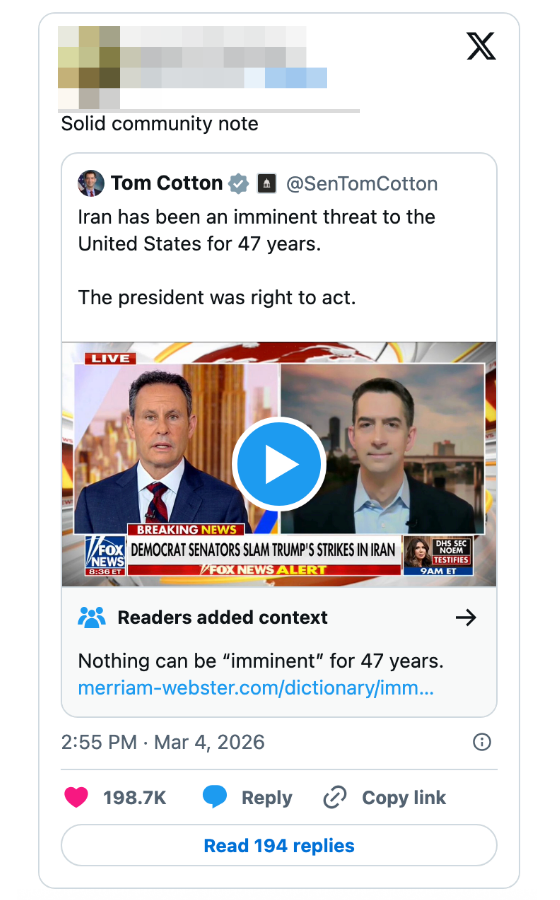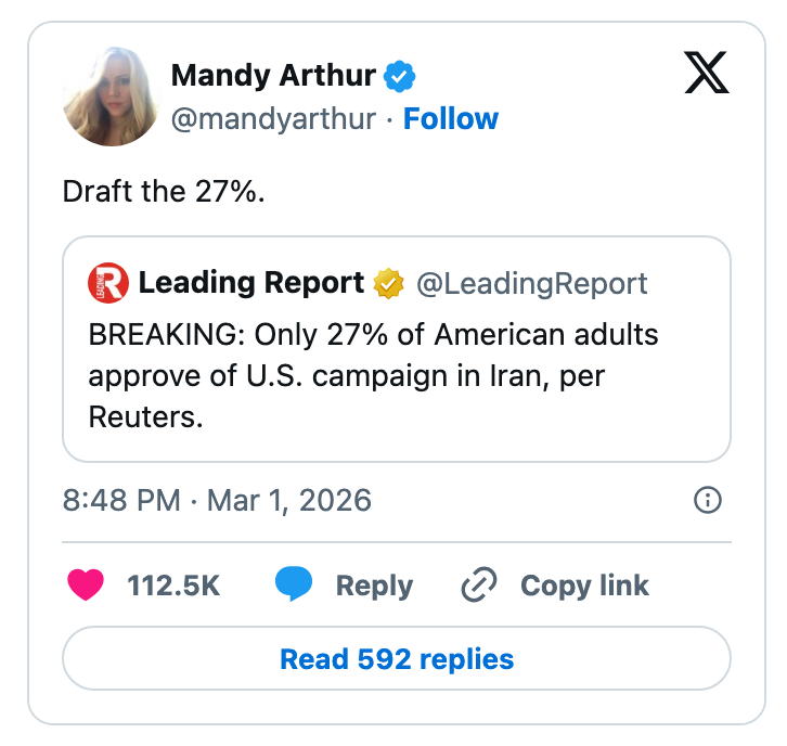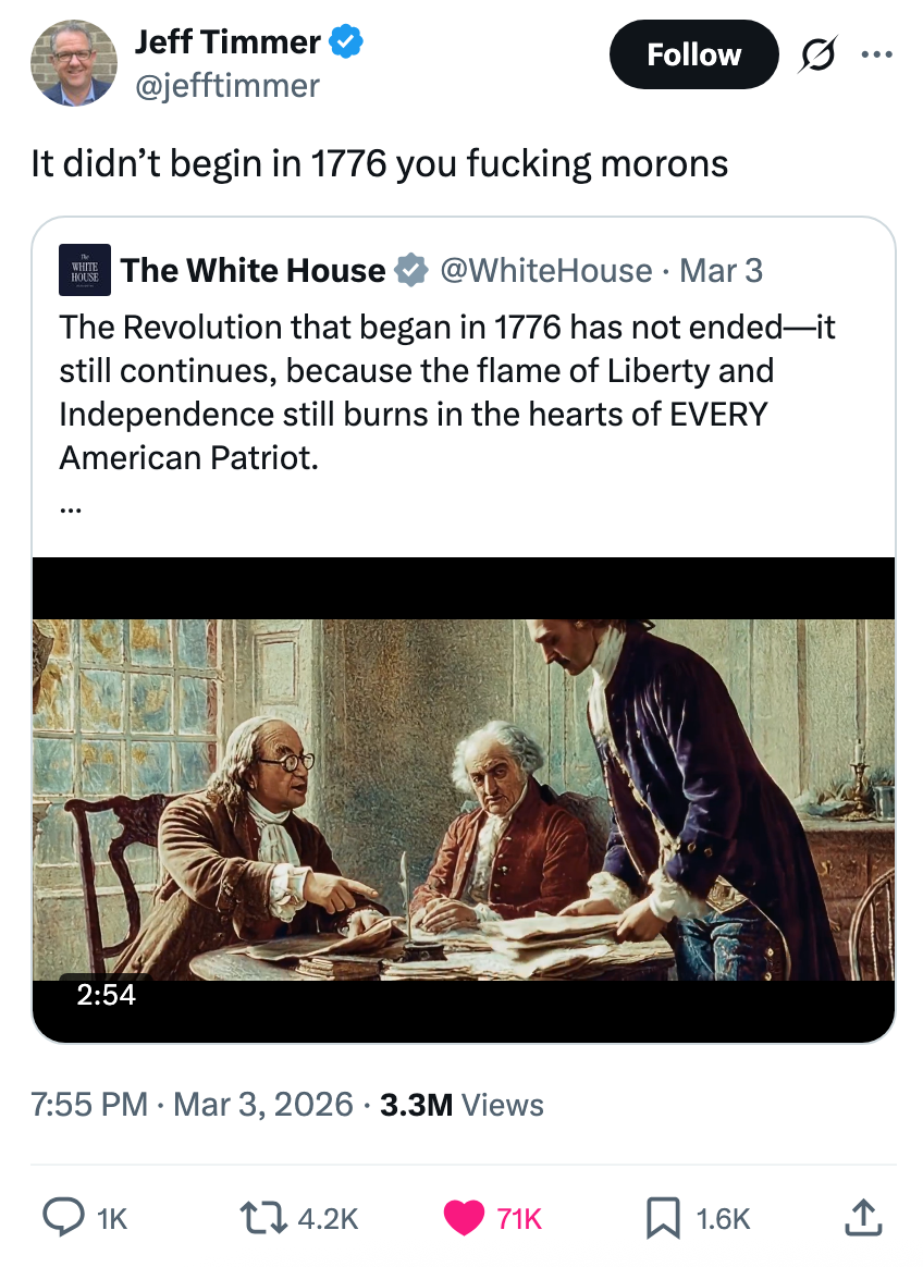 "Kash Patel is busy today praying he doesn’t get Noem’d since he needs the FBI jet to get to Coachella next month." I'm the AAPI Culture Editor here at BuzzFeed, where I cover everything from trending news to pop culture to AAPI issues. Editor's Note: While we can't endorse what X has become, we can bring you the worthwhile moments that still exist there, curated and free of the surrounding chaos. He looks alive to me. https://t.co/T0FzKy2Z3a You occasionally get a moment that symbolizes everything wrong with this country. In this case it's a U.S. Marine veteran screaming out that no one wants to fight for Israel and a U.S. Senator breaking his arm. A perfect encapsulation of US foreign policy. pic.twitter.com/FqgSvodurk This is frying me https://t.co/i0DWNMdnwe Can you imagine the Republican reaction if a woman president said she went to war because she had a “feeling” https://t.co/eJq82K1FB8 Rubio: “Iran is run by religious fanatics.”The White House right now: pic.twitter.com/zWxY3wvwAK US: “It was a preemptive attack on Iran”Pentagon: “No sign that Iran was going to attack first”US: “No but if Israel attacked Iran, then Iran would have attacked us, so we preemptively attacked them first” 🤡This is beyond satire. pic.twitter.com/Y6wRzO2CHx Holy shit, Senator Tillis just flash fried Kristi Noem over her failed leadership and FINALLY screamed at her for killing that puppy.This was BRUTAL. 🔥🔥🔥 pic.twitter.com/UtILasodt0 Lawrence O’Donnell: “The only president in history, who in the third day of a war, is talking to the world about the drapes that he chose.”Motherfucker is giving a drapery update 3 days into a war. Imagine FDR updating America on his fabric swatches during D-Day. pic.twitter.com/b1yuK7xnWW Mullin: Trump ended eight warsHunt: He started this oneMullin: This isn’t a warHunt: The Secretary of Defense, who calls himself the Secretary of War, said today, this is a war pic.twitter.com/TL5SKszXNM Note: The image in the original tweet was replaced here due to photo rights. Really seems like this is just occurring to him for the first time https://t.co/y3lkRcVBh6 I knew my teenage son was going to get into the liquor cabinet after I fell asleep and then go street racing. To prevent that, I drank all the booze myself, got into the car, and crashed it into the nearest oak tree.It was the responsible thing to do. pic.twitter.com/cgNKjd8ttB Note: The images in the original tweet were replaced here due to photo rights. Moskowitz: "Let me congratulate the former Homeland Security Secretary on her appointment to be the Shield of Americas, which I'm pretty sure the president came up with when he watched the last Avengers movie" pic.twitter.com/zapJmvuHpS Talarico: They're going to throw everything they have at us. They're going to call me a radical leftist. They're going to call me a fake Christian. They'll call our movement un-American. They'll call us a threat. The only truth is we are a threat to their corrupt system. pic.twitter.com/RZo22kR78q For more political tweets, check out our most recent roundup: "Please Restrain From Drinking Too Much As You Have Been Warned From Your Staff": 59 Political Tweets From The Last Month That Are So Brutal But So Real