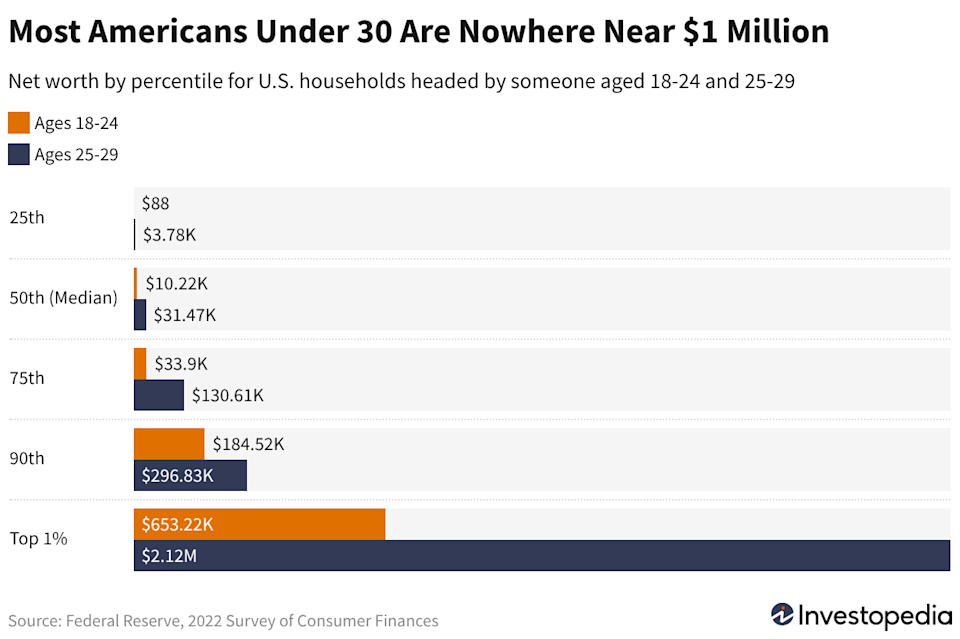 Millionaires under 30 are extremely rare. Only about 1.4% of Americans ages 18–29 have a $1 million net worth. Most young millionaires don’t have $1 million in cash or diversified assets. Much of that wealth is tied up in inheritance, startup equity, or other assets that are hard to sell. Scroll through social media long enough, and you might think everyone's a millionaire by 30. Most aren't. Not even close. Data from the Federal Reserve reveals that reaching millionaire status that young is rare, even as social media feeds can suggest otherwise. If you’re comparing your financial milestones to those of millionaires under 30, you're measuring yourself against the wrong benchmark. Social media filters out the boring majority. Trust the data. If we define “millionaire” as $1 million-plus net worth (total assets minus debts), few people under 30 come close. The numbers vary sharply even within this age range, according to the Federal Reserve's Survey of Consumer Finances (SCF). (The last data available is from 2022, with an update due later this year.) About 2% of households headed by someone aged 25 to 29 clear the million-dollar mark, while for those 18 to 24, the share drops below 1%. Blended across the full 18-to-29 group, about 1.4% are millionaires. The SCF measures households, not individuals. There are about 13.9 million households headed by someone under 30. At about 1.4% of the population, that translates to fewer than 200,000 millionaire households. The typical under-30 household isn't anywhere near seven figures. For households headed by someone aged 18 to 24, the median net worth is just $10,222. The average, pulled up by a small number of wealthy outliers, is $112,104. For households headed by someone 25 to 29, the median rises to $31,470 and the average to $120,183. A significant share of both groups carry negative net worth, meaning they have more debt than assets. Even within this already-small group, “millionaire” can mean very different things. And who has it is often shaped by opportunities, access and plain luck. Inheritance/windfall: Family money—gifts, trusts, insurance payouts—can push net worth past $1 million well before income alone would. Lottery winners count here, too, but you already know those odds. Paper wealth: Equity and stock options from a startup, or concentrated holdings that could be worth $1 million-plus today (or $0 tomorrow if things don’t go well). Self-made: The smallest group, their wealth has accumulated through earning a lot, saving aggressively, and sometimes riding a rising market. Wealth passed down via inheritance tends to arrive later than many think. The data show inheritances skew older, not “mid-20s.” Social media can make outliers sound like anything but when everybody is talking about them. A 28-year-old who patiently contributes to a 401(k) likely won’t go viral. A 28-year-old turning $200 in crypto into seven figures? That's the one you'll see. Survivorship bias also makes it easy to mistake “uncommon” for “average”. Most startups fail—we just never hear about them. And since most aren’t in the fortunate millionaire bucket, latching on to success stories can warp expectations—especially if you start treating them like a blueprint instead of what they really are: highlights from extreme rarities. It also blurs the meaning of being a "millionaire". Plenty of people who claim the label are “paper millionaires,” whose net worth is locked up in startup shares they can't sell easily, a highly volatile crypto token, or a property whose value depends on a hot market staying hot. That can look impressive on a screenshot, but it doesn’t translate into durable, spendable wealth. Building wealth early gives you more choices: flexibility around work, a cushion against setbacks, and time for compounding to do its work. But early wealth doesn't guarantee happiness, stability or staying on track. Many households don't start building real wealth until their 40s or 50s, once rising income, steady saving, and compounding start working together. While just 1.4% of households under 30 are millionaires, compared with about 25% of those in their 50s, and more than 27% of those in their 60s. The median age of a millionaire household in America is 62. So if you’re not a millionaire at 30, does that mean you’re falling behind? Of course not. The most dramatic outcomes get the most attention and start to seem normal. That pushes people toward high-risk paths, but often without the same timing, access or safety nets. A healthier takeaway is to treat early-millionaire stories like lottery winners: interesting, sometimes instructive, but not the only blueprint to follow. Read the original article on Investopedia