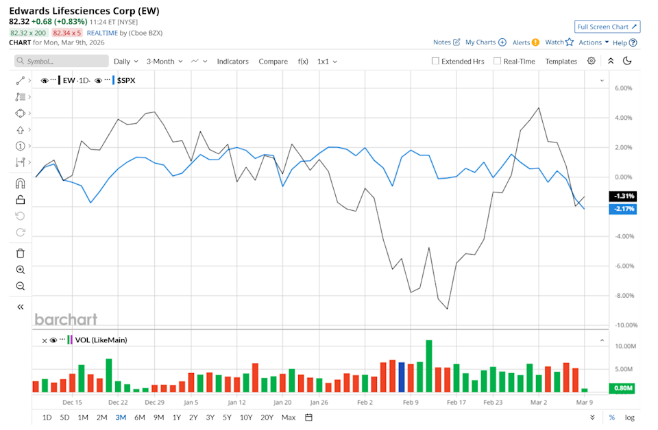Valued at a market cap of $47.4 billion, Edwards Lifesciences Corporation (EW) is an Irvine, California-based company that provides products and technologies to treat advanced cardiovascular diseases. Companies valued at $10 billion or more are typically classified as “large-cap stocks,” and EW fits the label perfectly, with its market cap exceeding this threshold, underscoring its size, influence, and dominance within the medical devices industry. The company recently divested its critical care unit, allowing it to sharpen its focus on high-growth areas like asymptomatic aortic stenosis and structural heart failure. ‘When You See One Cockroach, There are Probably More’: Blackrock Forced to Halt Redemptions As $2 Trillion Private Lending Bubble Starts Showing Cracks Analysts Say These Are the Top 3 Stocks to Buy Amid the U.S.-Israel War on Iran Iran War, CPI and Other Key Thing to Watch this Week Markets move fast. Keep up by reading our FREE midday Barchart Brief newsletter for exclusive charts, analysis, and headlines. This healthcare company has dipped 6.6% from its 52-week high of $87.89, reached on Dec. 5, 2025. Shares of EW have declined 1.8% over the past three months, outperforming the S&P 500 Index’s ($SPX) 2.4% drop during the same time frame. Moreover, in the longer term, EW has soared 16.3% over the past 52 weeks, outpacing SPX’s 15.7% uptick over the same time frame. However, on a YTD basis, shares of EW are down 4.1%, lagging SPX’s 2.5% loss. To confirm its recent bearish trend, EW has been trading below its 50-day moving average since early March. However, it has remained above its 200-day moving average since mid-February. On Feb. 10, EW delivered its Q4 results, and its shares surged 3% in the following trading session. The company’s net sales increased 13.3% year-over-year to $1.6 billion, while its adjusted EPS declined 1.7% from the year-ago quarter to $0.58. The company is advancing next-generation technologies such as the SAPIEN M3, the first transseptal mitral replacement option, while targeting $2 billion in Transcatheter Mitral and Tricuspid Therapies (TMTT) sales by 2030. EW has outperformed its rival, Medtronic plc (MDT), which declined 4.2% over the past 52 weeks and 5.7% on a YTD basis. Given EW’s recent outperformance, analysts remain moderately optimistic about its prospects. The stock has a consensus rating of "Moderate Buy” from the 31 analysts covering it, and the mean price target of $96.07 suggests a 15.9% premium to its current price levels. On the date of publication, Neharika Jain did not have (either directly or indirectly) positions in any of the securities mentioned in this article. All information and data in this article is solely for informational purposes. This article was originally published on Barchart.com