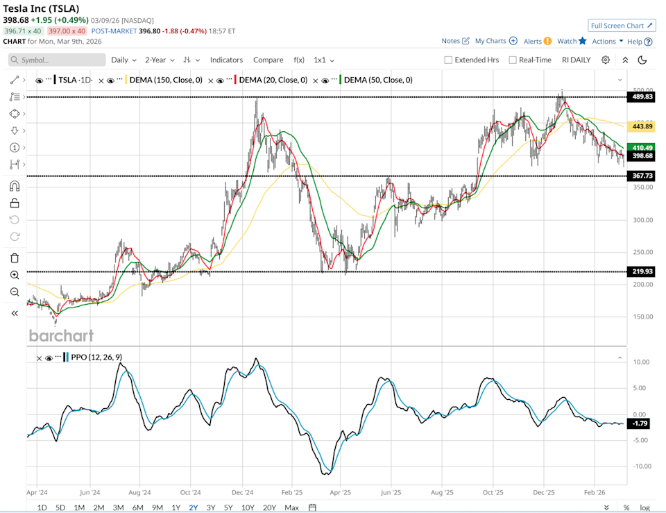 When I see a stock chart like Tesla’s (TSLA), I instantly consider three different paths. I can try to make money on a continued price decline. I can collar it, so I can grab the rebound but be protected if this is just another leg down. Or I can do nothing. Since the third choice would not make for much of an article, let’s examine the other two. This daily view is at best weak, and at worst the start of something deeper. I marked those lines on this chart a while ago, using a great Barchart feature that allows them to stay there until I remove them. I drew the top when it traded there for the second time in 12 months, late last year, and started to dip. That’s usually a sign the bears are in charge. ServiceNow Stock May Be Setting Up a Hidden Options Opportunity Unusual Options Activity in Small-Cap Stocks Hint at a Major Meltdown Coming Defense Stocks Like RTX Corp Look Attractive to Value Investors and OTM Option Plays Get exclusive insights with the FREE Barchart Brief newsletter. Subscribe now for quick, incisive midday market analysis you won't find anywhere else. With a volatile “story stock” like this one, the chart sometimes doesn’t do it justice. For instance, the lower boundary at $367 is 7% below Monday’s close. That’s a lot to me! So the next shelf level below, at $220, makes me not want to take much risk below perhaps $360 or so. The narrative has shifted from a pure electric vehicle story to a high-stakes bet on autonomous AI, creating a stark divide between those who see a trillion-dollar robotics future and those who see a car company with a crumbling foundation. The bull case centers on Tesla’s successful transition into a physical AI and energy powerhouse. Analysts point to the massive growth in the energy storage segment, where Megapack deployments have created a multi-year backlog and a high-margin revenue stream that is decoupled from car sales. Furthermore, bulls argue that Tesla’s valuation should be compared to Nvidia (NVDA) or Microsoft (MSFT) rather than Ford (F) or Toyota (TM). The belief is that Tesla is building a software-as-a-service model for transportation that will eventually generate the majority of its profits. From this perspective, the current price slide is merely a healthy consolidation before a late-2026 surge toward a $2 trillion market cap. The bear case is grounded in deteriorating automotive fundamentals and a growing regulatory storm. For the first time in its history, Tesla saw a slight annual revenue contraction in 2025, and Q1 2026 delivery estimates are tracking below 350,000 units, a figure that suggests the EV market has hit a saturation point. Bears argue that the aging Model 3 and Model Y designs are losing ground to fresh competition from BYD (BYDDY) and legacy automakers who have pivoted to hybrids. The slide in the stock price reflects a market that is no longer willing to trade on Elon Musk’s promises alone. It is instead now demanding tangible execution. With over $20 billion in planned AI capital expenditure for 2026, the company is spending heavily to secure its future, but this is compressing margins in the near term. In the above example, I used that $360 level for a put option out to August. And with a stock like this, which can catch a bull wave at any time given its fervent fan base, I targeted upside all the way at $500. TSLA is typically a solid collar stock, and it did not disappoint here. Nearly 2:1 up/down ratio, and a modest 2.3% net cost of the options. The Direxion Daily TSLA Bear 1X ETF (TSLS) would be the straight bearish way to play TSLA. As shown here, this $80 million ETF, now more than 2 years old, simply moves in the opposite direction of the stock. Whether the stock finds its footing or continues to slide will likely depend on the outcome of the NHTSA report and whether the robotaxi pilot can prove its safety and scalability to a skeptical public. Rob Isbitts created the ROAR Score, based on his 40+ years of technical analysis experience. ROAR helps DIY investors manage risk and create their own portfolios. For Rob's written research, check out ETFYourself.com. On the date of publication, Rob Isbitts did not have (either directly or indirectly) positions in any of the securities mentioned in this article. All information and data in this article is solely for informational purposes. This article was originally published on Barchart.com