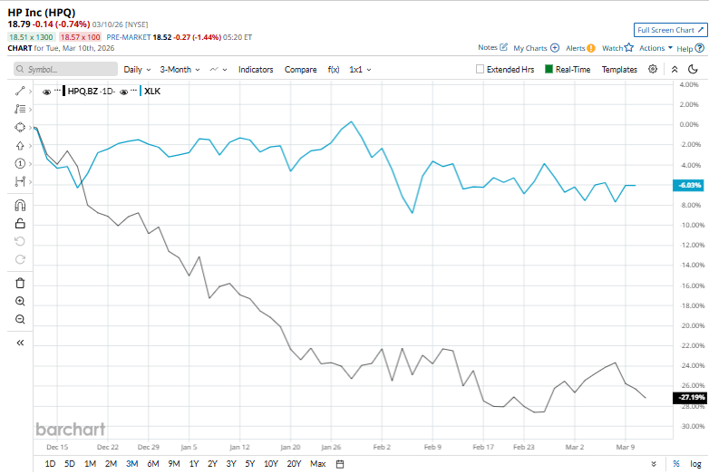 Palo Alto, California-based HP Inc. (HPQ) is a prominent technology company that develops and sells personal computing devices, printers, and related hardware, software, and services for consumers, businesses, and enterprises. With a market cap of $17.3 billion, the company offers products including laser and inkjet printers, scanners, copiers and faxes, personal computers, workstations, storage solutions, and computing and printing systems. Companies worth $10 billion or more are generally described as “large-cap stocks,” and HPQ perfectly fits that description, with its market cap exceeding this mark, underscoring its size, influence, and dominance within the computer hardware industry. With a strong global distribution network and a large installed base of devices, HP Inc. maintains a significant presence in the PC and printing markets. Stock Index Futures Turn Lower as Bond Yields Climb 2 Ways to Profit from a Fading Tesla Stock Price Cathie Wood Bets $19 Million on 5 Beaten-Down Stocks Stop Missing Market Moves: Get the FREE Barchart Brief – your midday dose of stock movers, trending sectors, and actionable trade ideas, delivered right to your inbox. Sign Up Now! However, HPQ has faced challenges and has slipped 37.1% from its 52-week high of $29.89. Over the past three months, HPQ stock has declined 26.3%, underperforming the State Street Technology Select Sector SPDR Fund’s (XLK) 6% decline during the same period. Shares of HPQ plunged 33.8% on a six-month basis and dipped 37.3% over the past 52 weeks, underperforming XLK’s six-month gains of 3.5% and 33.6% returns over the last year. To confirm the bearish trend, HPQ has been trading below its 50-day and 200-day moving averages since late October. On Feb. 24, HP released its fiscal 2026 first-quarter earnings and its shares dipped marginally. The company posted revenue of $14.4 billion, up 6.9% year over year, supported by strong demand in its Personal Systems segment. Adjusted earnings reached $0.81 per share, surpassing analysts’ expectations. During the quarter, the company continued to return capital to shareholders through $0.30 per share in dividends and $325 million in share repurchases. However, higher memory costs and a cautious forward outlook weighed on investor sentiment, raising concerns about potential margin pressure in the quarters ahead. In the competitive arena of computer hardware, Dell Technologies Inc. (DELL) has taken the lead over HPQ, showing resilience with a 15.6% uptick over the past six months and solid 59.2% gains over the past 52 weeks. Wall Street analysts are bearish on HPQ’s prospects. The stock has a consensus “Moderate Sell” rating from the 15 analysts covering it. The mean price target of $20.74 implies an upswing potential of 10.4% from the current market prices. On the date of publication, Kritika Sarmah did not have (either directly or indirectly) positions in any of the securities mentioned in this article. All information and data in this article is solely for informational purposes. This article was originally published on Barchart.com