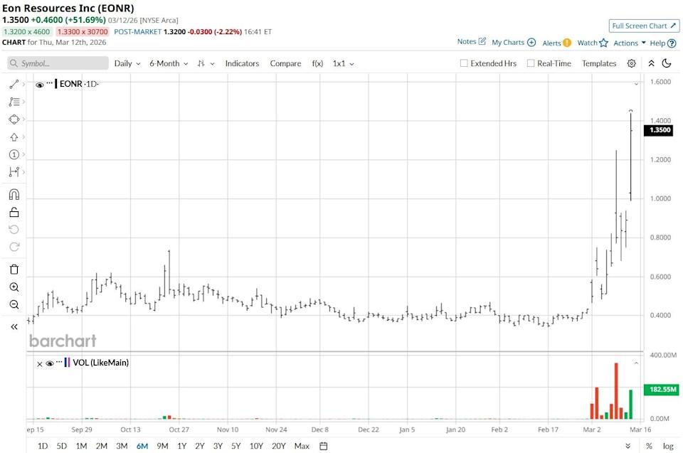 Eon Resources (EONR) shares ripped higher on Thursday after the Houston-headquartered firm said it has expanded its hedging to cover 75% of oil production for the next 15 months — and more than 50% for late 2027. Many of these contracts were locked in at prices exceeding $70 a barrel, enabling the Permian Basin producer to secure a guaranteed financial floor for the next 24 months. SoFi Stock Outlook: Can SoFi Technologies Recover After a 30% Drop? Stocks Slump on Iran War and Credit Woes Qualcomm Stock Warning: Why Bank of America Is Betting That QCOM Will Underperform Tired of missing midday reversals? The FREE Barchart Brief newsletter keeps you in the know. Sign up now! Eon Resources stock is now up an incredible 300% versus its year-to-date low. EONR announcement is bullish as it offers critical cash flow visibility at a time when the company is transitioning to a more capital-intensive horizontal drilling phase in the San Andres formation. By securing “no-cost swaps” and collar, Eon Resources has effectively insulated itself from a sudden collapse in crude prices, which is a major win for a micro-cap producer with high operating leverage. Furthermore, management said these hedges support future banking and acquisition needs as well. In short, EONR shares rallied today primarily because the ability to lock in $70 plus floor ensures the company can fund its 92-well development plan without immediate fear of a liquidity crunch. Risk-averse investors are still cautioned against chasing the momentum in Eon Resources, as it remains a volatile penny stock with significant financial hurdles. The company has a history of posting net losses and negative EBITDA, and while Q3 saw a brief surge in profitability, long-term consistency remains unproven. The bull case relies entirely on the successful execution of its horizontal drilling program — a high-stakes endeavor for a company with a market cap under $70 million. With more than 25% of near-term production still unhedged and a history of sharp sell-offs following news cycles, the risk of a “buy the rumor, sell the news” event remains extremely high for late-stage investors. A 14-day relative strength index (RSI) in the late 80s, indicating extremely overbought conditions, also suggests EONR will significantly retreat in the near term. Another major red flag on EONR stock is the absence of Wall Street coverage. This means investors lack professional guidance, consensus forecasts, and institutional support, which typically is a serious credibility and liquidity concern. This article was created with the support of automated content tools from our partners at Sigma.AI. Together, our financial data and AI solutions help us to deliver more informed market headline analysis to readers faster than ever. On the date of publication, Wajeeh Khan did not have (either directly or indirectly) positions in any of the securities mentioned in this article. All information and data in this article is solely for informational purposes. This article was originally published on Barchart.com