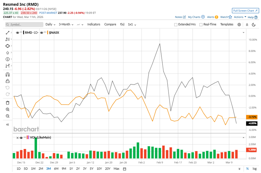 ResMed Inc. (RMD), headquartered in San Diego, California, manufactures, distributes, and markets medical devices and cloud-based software applications. Valued at $36 billion by market cap, the company offers a range of products for respiratory disorders, including diagnostic tools like ApneaLink Air and NightOwl, cloud-based platforms like AirView and myAir for patient monitoring, and U-Sleep for HME providers, connectivity solutions, as well as out-of-hospital software solutions. Companies worth $10 billion or more are generally described as “large-cap stocks,” and RMD perfectly fits that description, with its market cap exceeding this mark, underscoring its size, influence, and dominance within the medical instruments & supplies industry. ResMed's competitive edge stems from its diversified sleep and respiratory care portfolio, strong brand, and innovation in tech like AI-powered therapy and remote monitoring. With a global presence in 140+ countries, ResMed leverages its strengths to stay ahead. How to Create a 24% Synthetic Dividend on Intel (INTC) Stock Using Options Silver Is Going to Make Traders A Lot of Money: 2 Ways to Play It S&P Futures Waver as Middle East Conflict Uncertainty Persists, U.S. Inflation Data in Focus Get exclusive insights with the FREE Barchart Brief newsletter. Subscribe now for quick, incisive midday market analysis you won't find anywhere else. Despite its notable strength, RMD slipped 18.3% from its 52-week high of $293.81, achieved on Aug. 22, 2025. Over the past three months, RMD stock has declined 4.9%, underperforming the Nasdaq Composite’s ($NASX) 3.7% losses during the same time frame. Shares of RMD fell marginally on a YTD basis, outperforming NASX’s YTD losses of 2.3%. However, in the longer term, the stock climbed 6.4% over the past 52 weeks, underperforming NASX’s 30.3% returns over the last year. To confirm the bearish trend, RMD has been trading below its 200-day moving average since late October, 2025, with some fluctuations. The stock is trading below its 50-day moving average recently. On Jan. 29, RMD shares closed down slightly after reporting its Q2 results. Its adjusted EPS of $2.81 topped Wall Street expectations of $2.69. The company’s revenue was $1.42 billion, beating Wall Street forecasts of $1.39 billion. In the competitive arena of medical instruments & supplies, Baxter International Inc. (BAX) has lagged behind RMD, with a 5.6% downtick on a YTD basis and 49.7% losses over the past 52 weeks. Wall Street analysts are reasonably bullish on RMD’s prospects. The stock has a consensus “Moderate Buy” rating from the 19 analysts covering it, and the mean price target of $295.92 suggests a potential upside of 23.2% from current price levels. On the date of publication, Neha Panjwani did not have (either directly or indirectly) positions in any of the securities mentioned in this article. All information and data in this article is solely for informational purposes. This article was originally published on Barchart.com