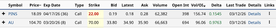 As I said in the introduction, Pinterest had the highest Vol/OI ratio by far yesterday.