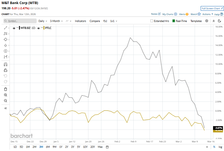 Buffalo, New York-based M&T Bank Corporation (MTB) is a bank holding company for Manufacturers and Traders Trust Company and Wilmington Trust, National Association. Operating through its Commercial Bank, Retail Bank, and Institutional Services and Wealth Management segments, the company provides a comprehensive suite of financial products and services. Companies valued at $10 billion or more are generally considered “large-cap” stocks, and M&T Bank, with a market cap of $30.3 billion, fits this criterion perfectly. M&T has historically focused on relationship-driven banking and conservative lending practices, which have helped it maintain stable asset quality and consistent profitability through economic cycles. SoFi Stock Outlook: Can SoFi Technologies Recover After a 30% Drop? Stocks Slump on Iran War and Credit Woes Qualcomm Stock Warning: Why Bank of America Is Betting That QCOM Will Underperform Tired of missing midday reversals? The FREE Barchart Brief newsletter keeps you in the know. Sign up now! MTB stock has dipped 17.1% from its 52-week high of $239. Shares of the company have decreased 2.8% over the past three months, outpacing the Pacer Trendpilot US Large Cap ETF’s (PTLC) 3.1% drop during the same period. Over the past 52 weeks, MTB stock has surged 15.2%, outpacing the ETF’s 6.5% rise over the same period. However, M&T Bank shares have dropped marginally over the past six months, trailing PTLC’s marginal surge. MTB stock slipped below its 50-day moving average last month but has fared above its 200-day moving average since late November. On Feb. 18, MTB shares rose 1.5% after the company announced a quarterly cash dividend of $1.50 per share on its common stock. The dividend is scheduled to be paid on March 31, 2026, reflecting the company’s continued commitment to returning capital to shareholders. In comparison, large-cap industry peer Citizens Financial Group, Inc. (CFG) has outperformed MTB stock. CFG stock has gained 9.9% over the past six months and 40.7% over the past 52 weeks. Despite MTB's underperformance over the past year, analysts are moderately optimistic about the stock's prospects. The stock has a consensus rating of “Moderate Buy” from the 23 analysts covering it, and the mean price target of $235.26 indicates a 18.7% premium to current levels. On the date of publication, Kritika Sarmah did not have (either directly or indirectly) positions in any of the securities mentioned in this article. All information and data in this article is solely for informational purposes. This article was originally published on Barchart.com