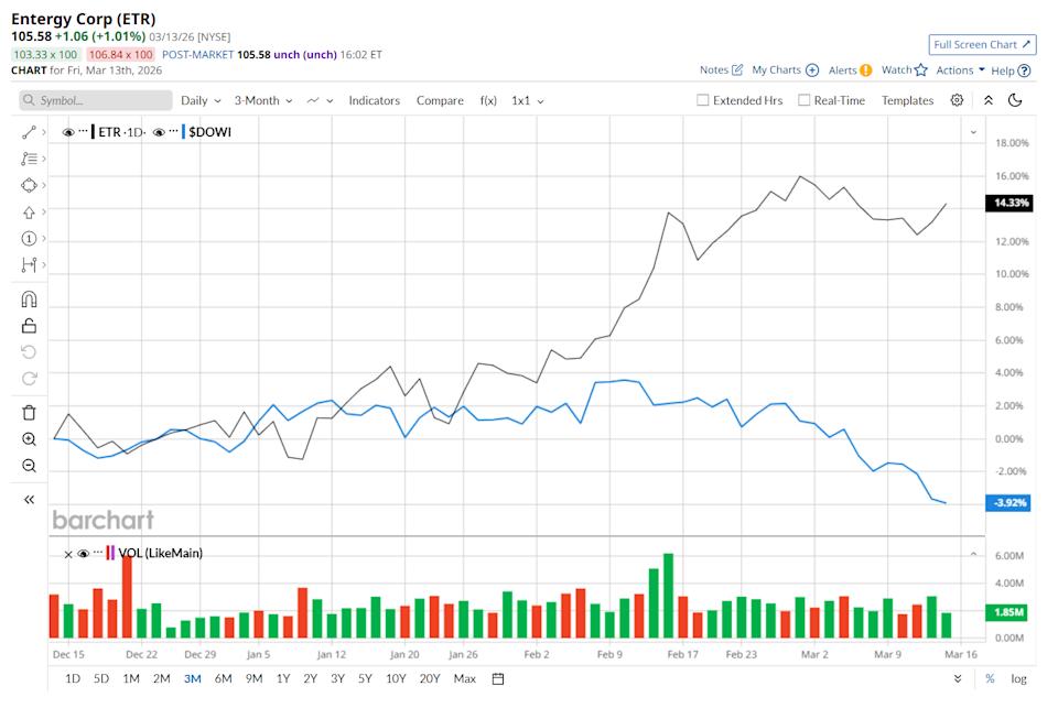 Valued at a market cap of $47.3 billion, Entergy Corporation (ETR) is a New Orleans, Louisiana-based energy company that offers electric power production and retail distribution services. Companies valued at $10 billion or more are typically classified as “large-cap stocks,” and ETR fits the label perfectly, with its market cap exceeding this threshold, underscoring its size, influence, and dominance within the utilities - regulated electric industry. The company is currently undergoing a strategic transformation focused on grid resilience and clean energy transition, aiming for net-zero carbon emissions by 2050, while recently securing major service agreements with large-scale data center operators to drive regional economic growth. How the Microsoft Stock Correction Created a $4K Options Opportunity Tesla Turns into A ‘Software-Killer’ With Macrohard: Is the Stock a Buy Now? Microsoft Is Racing to Beat Claude Cowork. A Big Catalyst for MSFT Stock Is Coming May 1. Markets move fast. Keep up by reading our FREE midday Barchart Brief newsletter for exclusive charts, analysis, and headlines. This utility company is currently trading 2.2% below its 52-week high of $107.93, reached on Mar. 2. Shares of ETR have soared 14.1% over the past three months, outperforming the Dow Jones Industrial Average ($DOWI) 4% drop during the same time frame. Moreover, on a YTD basis, shares of ETR are up 14%, compared to DOWI’s 3.2% fall. In the longer term, ETR has surged 27.2% over the past 52 weeks, outpacing DOWI’s 14% uptick over the same time frame. To confirm its bullish trend, ETR has been trading above its 200-day moving average over the past year, and has remained above its 50-day moving average since mid-January. On Feb. 12, shares of ETR advanced 1.8% after its Q4 earnings release. The company’s adjusted EPS of $0.51 declined 22.7% from the same period last year, but came in line with analyst estimates. Additionally, ETR initiated its fiscal 2026 adjusted EPS guidance in the range of $4.25 to $4.45. ETR has underperformed its rival, American Electric Power Company, Inc. (AEP), which soared 28.2% over the past 52 weeks and 15.9% on a YTD basis. Looking at ETR’s recent outperformance, analysts remain highly optimistic about its prospects. The stock has a consensus rating of "Strong Buy” from the 22 analysts covering it, and the mean price target of $109.53 suggests a 3.7% premium to its current price levels. On the date of publication, Neharika Jain did not have (either directly or indirectly) positions in any of the securities mentioned in this article. All information and data in this article is solely for informational purposes. This article was originally published on Barchart.com