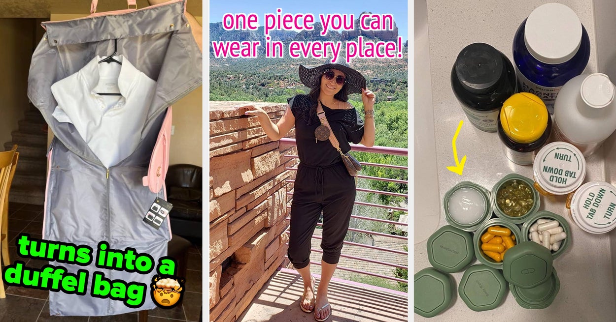 We hope you love our recommendations! While every product is independently chosen by our editors, BuzzFeed and our publishing partners may collect a share of sales or other compensation from the links on this page. You can read more about how our affiliate partnerships work in our Editorial Standards & Ethics Guide. Including a wrap top you can wear at least five different ways! Talk about making the most of what's in your carry-on. Just pack in your clothes, roll up the bag, and watch as the excess air is squeezed out. BuzzFeed Shopping writer Emma Lord says, "HELLO, I AM OBSESSED WITH THESE. Despite all the rave reviews, I was definitely skeptical of space-saving bags that didn't require a vacuum, and even as they were actively squishing my clothes into oblivion, I still couldn't quite believe it. I had easily two suitcases worth of clothes I wanted to pack for a three-week trip to London, and I managed to neatly pack the entirety of my wardrobe in one roller carry-on bag. Truly, all I had to do was put my clothes in the bag, push them to the bottom, and then sit on it to get the air out before sealing it up. I had tons of extra bags and made a habit of taking them with me in case other people joining me on trips need them to be able to pack souvenirs on the way home. I'm never taking a long trip without these again — these are worth every damn penny." Promising review: "I travel monthly for work, usually gone for 4–5 days. Before these, I would have to check a bag. Dress shirts and pants roll up nicely and stay wrinkle free. It's tempting to want to over-stuff these, but if you're packing golf shirts or clothes with 'slippery' fabric, they slide out of the top of the bag as you get close to the end. The clips take a minute to get used to, but after a couple of times zipping up the bags, it's pretty easy." —BigSkinny Get a set of eight from Amazon for $11.28. Promising review: "These packing cubes are the best. I use them for long weekends or two-week trips. They help me pack things as I would use them and locate what I need inside my suitcase, especially on trips where we change hotels every couple of days and don't unpack into the hotel closet." —Pat Get a set of eight packing cubes (including a laundry bag) from Amazon for $16.99+ (available in 18 colors and a set of six). BuzzFeed Shopping editor Elizabeth Lilly says: "I snagged this backpack after hearing my colleague Chelsea Stuart sing its praises. I wanted a bag for some upcoming travel (2.5 weeks in Europe with *just* carry-on for five flights) that opens up like a suitcase for easier packing. Since buying, I've taken it on two long weekend trips with no complaints. In fact, for both of those trips I packed MORE than I needed. Inside, you'll find a mesh zippered pocket and a plastic pocket perfect for your toiletries. I can fit enough wet toilet toiletries in the second pocket as I'd be allowed to carry-on for a plane. In the mesh pocket I put other necessities like cotton swabs, medicine, eye glasses, etc. The main compartment is deceptively deep so you can easily roll clothes and Lego-fit them in together without using packing cubes. In fact, I fit all of the stuff in the second picture in that section (a romper, PJs, a bikini, sunscreen, five pairs of undies, a pair of jean shorts, nap dress, three pairs of socks, two pairs of sandals, two T-shirts, a slip skirt, sleep mask, curling iron, mini flat iron, makeup bag, and tote bag). AND it has stretchy X-straps to keep it all secure like you'd see in a roller suitcase so when I unzip it, everything stays put. But before I forget, there's a separate cushioned laptop pocket close to the backpack straps that I found works well for books or a Kindle if your travel leaves you laptop-less. I love that this backpack has DEEP side pockets so your umbrella or water bottle won't fall out. In fact, I stuck a flashlight and an umbrella in one side pocket. (You could always use a flashlight.) Plus! It has a generously sized pocket on the front of the backpack with easy access for sunglasses, snacks, writing pens...all sorts of those little extras you need to access quickly. To top it all off, the backpack straps and top handle are STURDY. I felt totally secure toting it around and slinging it into overhead storage compartments on the trains. I love the look and construction of it with faux leather and sturdy black canvas, and the trolley passthrough to easily fit on my roller suitcase I'm about to drag through a bunch of airports. This isn't the cheapest backpack option but if you're a frequent traveler, you'll get so much mileage on it and seriously save on some baggage fees, making it well worth the cost. This backpack and I are going places, for sure." Get it from Beis Travel for $118 (available in four colors). Beauty Goodies is a small business that specializes in chic storage and travel accessories. Promising review: "This garment bag is an exceptional value for the money. Well built, top quality materials, including 'beefy' zippers, should hold up well for airline travel. Minimal wrinkles if any in garments, and a cavernous bag for storing shoes and other items for a trip. Added bonus, it fits easily in the plane overhead storage, similar in size to a standard roller bag. I highly recommend this product." —Kindle Customer Get it from Amazon for $42.99+ (available in three colors). Psst — if you don't fill up all the compartments with pills, it's also great for stashing your earrings during travel! (Shoutout to this TikToker for the hack.) Promising review: "My husband and I travel a lot and take a number of prescription drugs. It was always a hassle accessing our medication when needed, so I purchased this organizer to make things easier. I used a label maker and labeled each little compartment and it has performed wonderfully. I highly recommend this organizer to anyone who travels and needs medications throughout the day." —Jacqueline Get it from Amazon for $5.99+ (