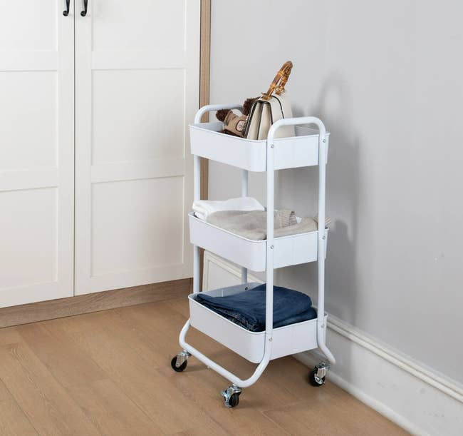 Promising review: “Good solid cart. I use it as a mobile home office. I inverted the top basket for a flat surface for my laptop. Great place for the laptop because the bottoms of the metal baskets are mesh, so it's great for keeping the laptop ventilated. Then I use the next two metal baskets for my accounting and bank books, office supplies such as a stapler, paper clips, tape, and pens, etc. Can easily roll it anywhere in my house and out on my porch. Love it!” —WalmartCustomer