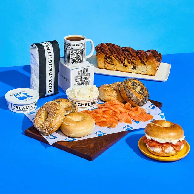 This package includes a pound of Gaspe Nova Smoked Salmon, six assorted bagels, a pound of plain cream cheese, a choice of a cinnamon or chocolate babka, 12 ounces of ground coffee, and a Russ & Daughters ceramic storefront mug. There’s also an option to add on additional merch, like a sweatshirt or T-shirt.