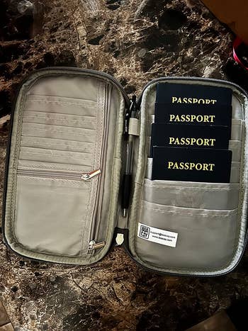 Promising review: "I took my kids on their first international trip, and this thing was a total lifesaver. It fits easily in a fanny pack or small purse for easy access, and it fits my whole family's passports, vaccine cards, boarding passes, and a pen with plenty of room for cash and cards if you decide to use it as a wallet for your trip. It made getting checked in a breeze and helped my family keep everything organized." —Kevin Garcia
