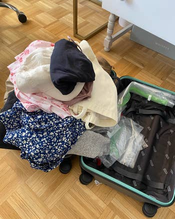 BuzzFeed Shopping writer Emma Lord says, "HELLO, I AM OBSESSED WITH THESE. Despite all the rave reviews I was definitely skeptical of space-saving bags that didn't require a vacuum, and even as they were actively squishing my clothes into oblivion I still couldn't quite believe it. I had easily two suitcases worth of clothes I wanted to pack for a three-week trip to London, and I managed to neatly pack the entirety of my wardrobe in one roller carry-on bag. Truly all I had to do was put my clothes in the bag, push them to the bottom, and then sit on it to get the air out before sealing it up. I had tons of extra bags and make a habit of taking them with me in case other people joining me on trips need them to be able to pack souvenirs on the way home. I'm never taking a long trip without these again — these are worth every damn penny."