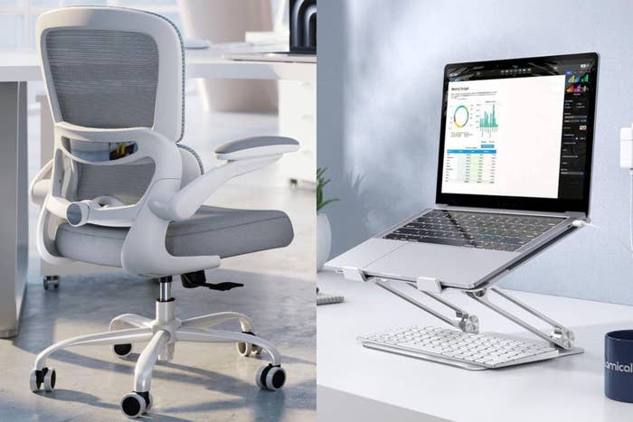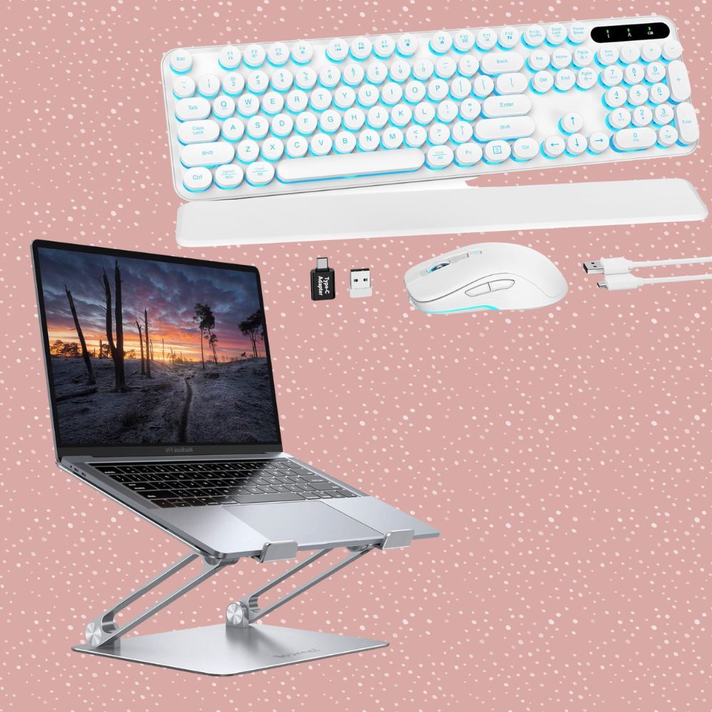 We found this laptop riser and Bluetooth keyboard and mouse set, which, together, offer ergonomic functionality for laptop users. The portable laptop riser, which is compatible with laptops up to 17.3 inches, can securely hold computers at a posture-appropriate angle.
