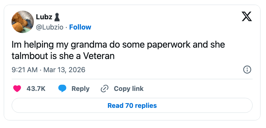 "Im helping my grandma do some paperwork and she talmbout is she a Veteran." Hi, I’m Michaela Bramwell, and I'm a Junior Staff Writer here at BuzzFeed, covering everything trending news, from your latest viral TikTok to the chaos of today's politics. Editor's Note: While we can't endorse what X has become, we can bring you the worthwhile moments that still exist there, curated and free of the surrounding chaos. My Lungs Are Physically Sore From Laughing So Hard At These 15 Hilarious Black Twitter Tweets From The Week