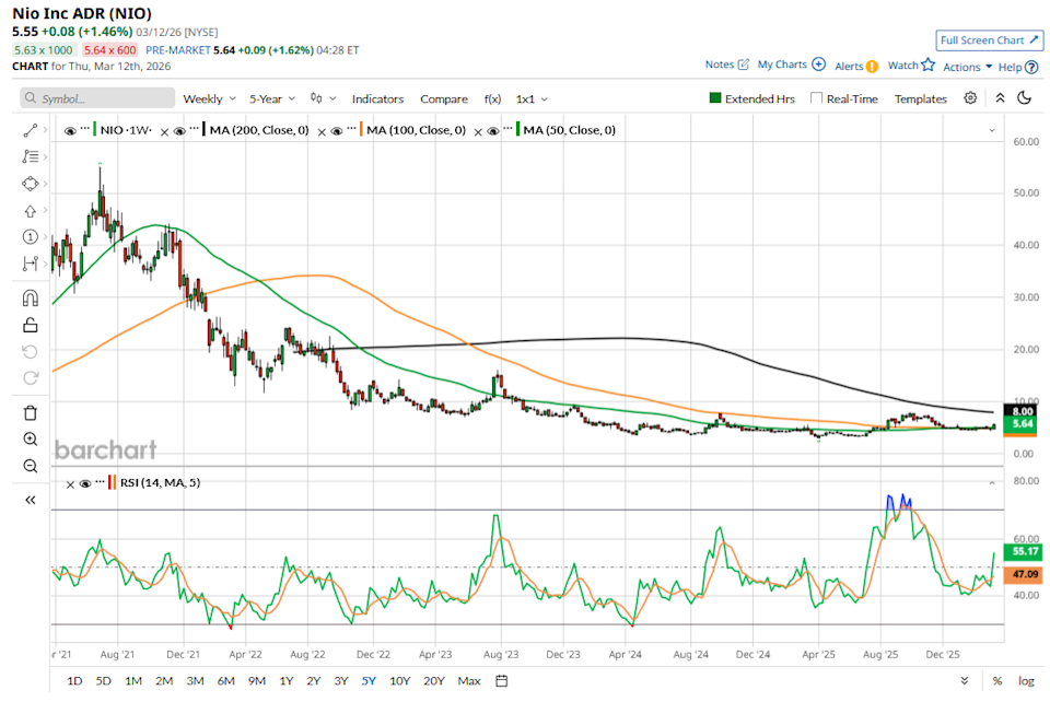 Nio (NIO) stock has gained over 21% over the last five days and is up 13.5% for the year. The price action might not look astonishing in a silo, but it comes at a time when U.S. stocks, including electric vehicle (EV) names, have slumped amid the broader-market meltdown. In my previous article, I noted that NIO’s risk-reward was looking attractive for 2026. With the stock up significantly from those levels, let’s explore whether it can continue its uptrend this year. The recent uptrend in NIO has been driven by its strong Q4 2025 performance. While startup EV companies are not exactly known for keeping promises, NIO delivered its first-ever adjusted profit in Q4, as management had guided. And, the company generated positive free cash flows in the quarter and ended the year with cash and cash equivalents of $6.67 billion. It wasn’t a mean achievement given the bloodbath in the startup EV space, where price wars have taken a toll on margins, and many companies continue to burn cash. Iran War, Fed Conundrum and Other Key Things to Watch this Week This Stock Has an 18%+ Annual Yield, Pays Monthly, and is Covered by Cash Flow Uber Expands Robotaxi Empire With Nissan Deal. Is UBER a Buy Now? Get exclusive insights with the FREE Barchart Brief newsletter. Subscribe now for quick, incisive midday market analysis you won't find anywhere else. NIO's guidance was also quite upbeat, and the top end of its Q1 guidance implies deliveries nearly doubling on an annual basis. NIO tasted success with its new models and is set to launch more models this year, which will help spur sales. While the company expects overall vehicle sales in China to dip this year, it expects battery electric vehicle (BEV) penetration levels to rise. Notably, while sales of plug-in hybrids have sagged in China, which has particularly taken a toll on BYD’s (BYDDY) fortunes, BEV sales are still strong, which bodes well for companies like NIO, as it only sells BEVs. The management reaffirmed its guidance of volume growth of between 40% and 50% this year, which looks encouraging considering the otherwise sorry state of the country’s automotive industry. Further, NIO is expanding globally, which would help it increase its volumes. Notably, while multiple countries clamped down on EV imports from China, some are warming up to the world’s second biggest economy. For instance, Canada has lowered tariffs on EV imports from China, albeit with a quota, and the E.U. is considering replacing tariffs with a minimum floor price for Chinese cars. Other countries might also take a more favorable view of EV imports from China, as the spike in oil prices could lead to a renewed push for electric cars. On the margin front, NIO expects to mitigate the impact of higher input costs, including memory prices, through supply chain optimization. Its margins would also be supported by the launch of new SUV models this year, which typically have a higher margin. NIO’s strong Q4 performance got a vote of confidence from the sell-side analyst community, and Nomura upgraded the stock to a “Buy” for the first time since 2023, even as it lowered its target price to $6.60. Previously, Macquarie had upgraded the stock to an “outperform” in January. Overall, NIO is rated a “Moderate Buy” with a mean target price of $6.05, which is 3% higher than current price levels. China has tweaked the subsidy for EV cars and now offers a 12% subsidy, which is capped at 20,000 yuan. The tweak has dampened sales of budget models as they were previously eligible for the full 20,000-yuan subsidy. Given its higher price point, NIO's premium eponymous brand would still get the full 20,000-yuan subsidy, as under the previous regime. There would be an impact on the budget brand Firefly, but since the bulk of the company’s sales came from the premium NIO brand, it wouldn’t be as impacted as budget EV makers, particularly BYD. NIO’s chip subsidiary Shenji is developing its second chip and exploring third-party customers, including those in the automotive industry. The company’s chip manufacturing strategy fits well into the Chinese government’s policy of promoting domestic semiconductors and reducing reliance on imported chips. These chips would also help NIO lower input costs as it transitions from Nvidia (NVDA) chips to in-house silicon. From a valuation perspective, NIO trades at just about 0.76x its expected sales for the current year, which looks quite reasonable to me. With the company delivering on the Q4 adjusted profit guidance and reaffirming up to 50% delivery growth in 2026 despite industry headwinds, I remain constructive on NIO stock and expect it to rise further from these levels this year. On the date of publication, Mohit Oberoi had a position in: NIO, NVDA. All information and data in this article is solely for informational purposes. This article was originally published on Barchart.com