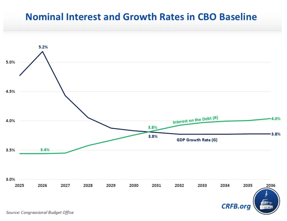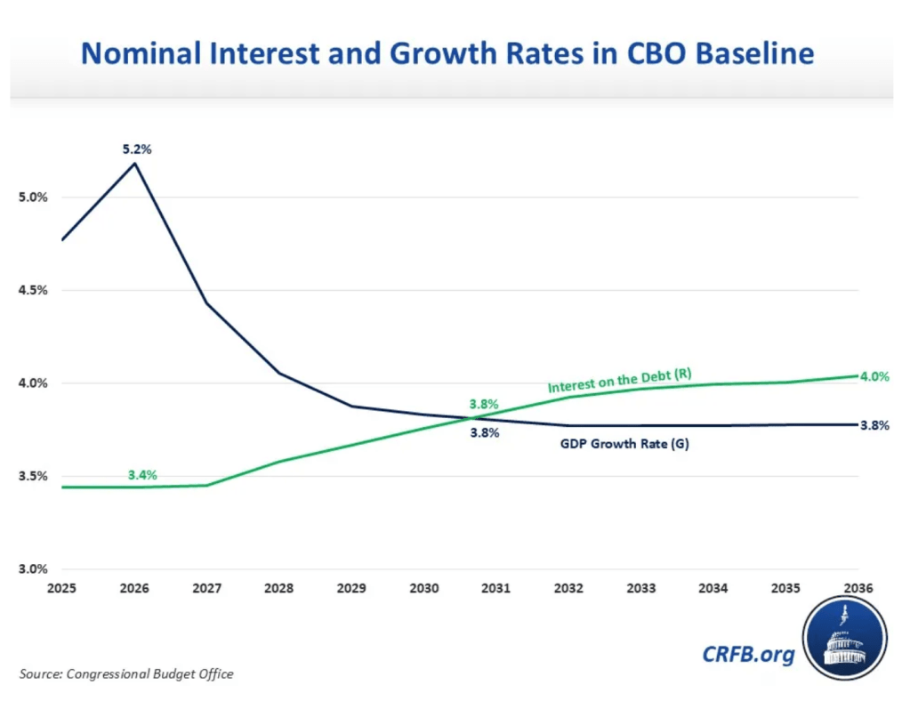 The U.S. national debt is hurtling toward $39 trillion, but a Washington fiscal watchdog says the more alarming milestone isn’t a dollar figure—it’s a ratio. And it arrives in just five years. According to a recent analysis from the Committee for a Responsible Federal Budget (CRFB), the Congressional Budget Office’s latest projections show that by fiscal year 2031, the average interest rate paid on the federal debt will exceed the country’s rate of economic growth. In the dry shorthand of economists, “R will exceed G.” In plain terms, that means that the cost of borrowing will be growing faster than the economy’s ability to pay for it. “Once interest rates exceed the growth rate…primary deficits will lead debt to grow indefinitely,” the CRFB warned in a blog post published March 9. For most of the past 60 years—including all of the last 15—the U.S. has benefited from a structural cushion: interest rates on federal debt stayed below the pace of economic growth. That relationship, which economists measure as R<G, meant that even as the government ran persistent deficits, debt as a share of GDP could remain stable or even shrink. The economy, growing faster than the debt’s carrying cost, was effectively eroding the burden over time. Real interest rates on federal debt averaged just 0.9% over the past 15 years, while real GDP growth averaged 2.2%. That buffer is now evaporating, according to the CRFB. Since 2023, most newly issued Treasury debt has carried yields between 4% and 5%—rates that exceed the economy’s long-term expected growth rate. As older, cheaper debt matures and gets rolled over at these higher rates, the average interest cost on the entire federal debt stock is creeping upward. CBO now projects that by 2031, both R and G will hit roughly 3.8% nominally—and then diverge, with R pulling ahead. The CRFB describes what comes next as a self-reinforcing feedback loop. Higher debt pushes interest rates up and slows economic growth. Slower growth reduces tax revenues. Reduced revenues widen deficits. Wider deficits add more debt. More debt pushes rates higher still. “Over time,” the group warns, “this could lead to accelerating growth in the debt, which could eventually be too rapid to correct, absent a major disruption or crisis.” Even CBO’s relatively optimistic “baseline” scenario—which does not model additional tax cuts or spending increases—projects the national debt will balloon to an unprecedented 175% of GDP by 2056. By that year, CBO estimates the interest rate will reach 4.2%, against a GDP growth rate of just 3.5%—a gap of 0.7 percentage points. Closing that gap alone, the CRFB calculates, would require roughly $2.7 trillion in annual spending cuts or tax increases—in 2056 alone. The CRFB’s warning carries an implicit rebuke of Washington’s current fiscal trajectory. If lawmakers continue enacting tax cuts and spending increases—as they did in the One Big Beautiful Bill Act, which CBO estimates will add $4.7 trillion to deficits through 2035—the spiral “could arrive sooner and with greater intensity than projected.” The national debt is expected to cross $39 trillion within days, up more than $2.6 trillion in the past year alone. But as the CRFB makes clear, the real danger isn’t the next trillion. It’s the arithmetic of what happens when a country can no longer grow its way out of its debt—and the window to act before that moment closes in just five years. For this story, Fortune journalists used generative AI as a research tool. An editor verified the accuracy of the information before publishing. This story was originally featured on Fortune.com