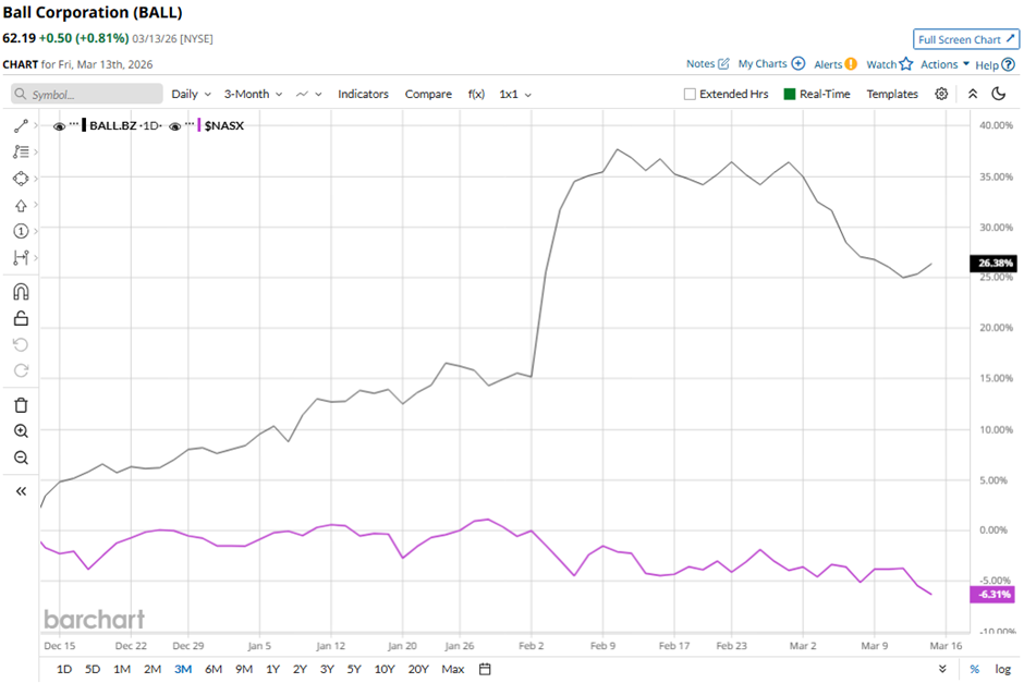 Shares of the Westminster, Colorado-based company have fallen 8.9% from its 52-week high of $68.29. BALL stock has soared 22.2% over the past three months, outpacing the broader Nasdaq Composite's ($NASX) 4.7% decline over the same time frame.