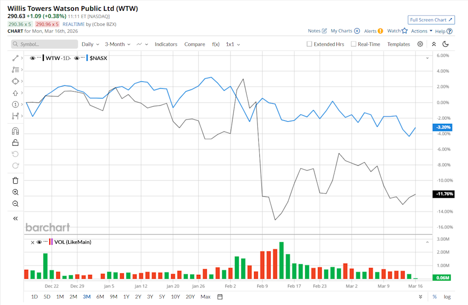 London, the United Kingdom-based Willis Towers Watson Public Limited Company (WTW) is a leading global advisory, broking, and solutions firm with a market cap of $27.4 billion. It provides a comprehensive suite of services, including human capital consulting, benefits administration, investment advisory, and specialized corporate risk management and insurance brokerage. Companies valued at $10 billion or more are typically classified as “large-cap stocks,” and WTW fits the label perfectly, with its market cap exceeding this threshold, underscoring its size, influence, and dominance within the insurance brokers industry. The company’s core strengths lie in its deep technical expertise, particularly in actuarial science and insurance consulting technology, where it leverages proprietary software suites like Radar and ResQ to serve global insurers. NIO Is Outperforming Even as U.S. Stocks Slump: Can the Uptrend Continue? Iran War, Fed Conundrum and Other Key Things to Watch this Week Uber Expands Robotaxi Empire With Nissan Deal. Is UBER a Buy Now? Get exclusive insights with the FREE Barchart Brief newsletter. Subscribe now for quick, incisive midday market analysis you won't find anywhere else. This financial company has dipped 17.1% from its 52-week high of $352.79, reached on Oct. 7, 2025. Shares of WTW have declined 11.4% over the past three months, underperforming the Nasdaq Composite’s ($NASX) 3.1% drop during the same time frame. Moreover, on a YTD basis, shares of WTW are down 11.1%, compared to NASX’s 3.7% fall. In the longer term, WTW has fallen 10% over the past 52 weeks, lagging behind NASX’s 26.1% uptick over the same time frame. To confirm its bearish trend, WTW has been trading below its 200-day and 50-day moving averages since early February. Willis, a WTW business, announced the continued expansion of its GB Affinity technology ecosystem through a strategic partnership with Qover, a European leader in embedded insurance orchestration. This collaboration aims to address the growing demand for seamless and contextual insurance solutions at the point of sale. Through this partnership, Willis and Qover will deliver a product-agnostic platform that enables businesses to launch customized insurance programs efficiently and at scale, while also supporting innovation, sustainability, and evolving customer needs. WTW has outperformed its rival, Marsh & McLennan Companies, Inc. (MRSH), which declined 24.6% over the past 52 weeks. However, it has lagged MRSH’s 6% YTD drop. Despite WTW’s recent underperformance, analysts remain moderately optimistic about its prospects. The stock has a consensus rating of "Moderate Buy” from the 23 analysts covering it, and the mean price target of $369.63 suggests a 27.1% premium to its current price levels. On the date of publication, Neharika Jain did not have (either directly or indirectly) positions in any of the securities mentioned in this article. All information and data in this article is solely for informational purposes. This article was originally published on Barchart.com