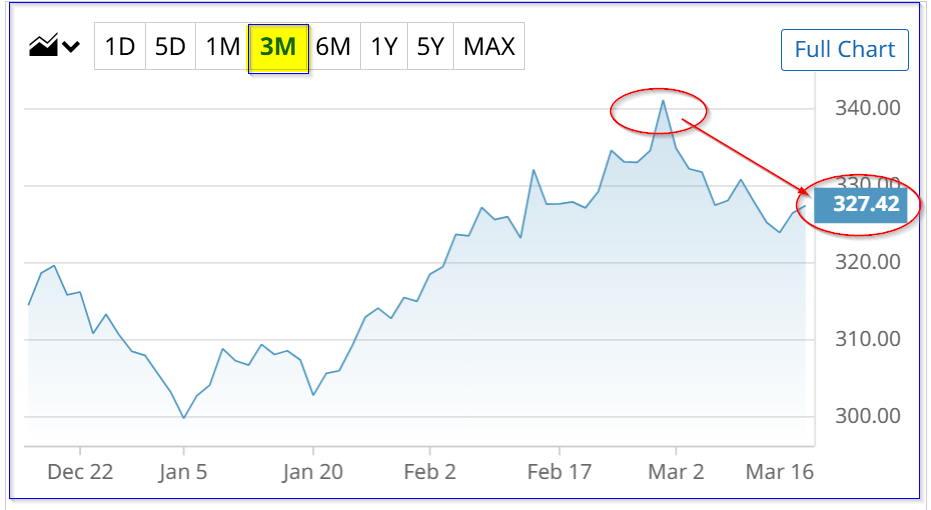 For example, look at the April 17 expiration period. It shows that the $315.00 strike price put contract, which is 4% lower than today's price, has a midpoint premium of $3.01.