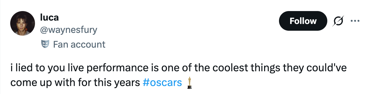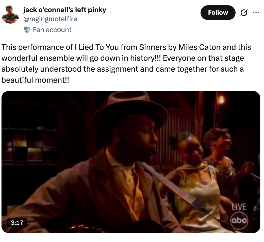 "Misty Copeland comes out of retirement to put Timothée Chalamet in his place during a live ‘Sinners’ performance at the #Oscars." If you must know, I based my entire personality on Seasons 2-5 of "Girls," and I'm a huge gamer. Misty Copeland comes out of retirement to put Timothée Chalamet in his place during a live ‘Sinners’ performance at the #Oscars. pic.twitter.com/EhUIOEw8jg Chalamet when Misty Copeland dances by pic.twitter.com/jpIt3oSUuZ Seeing Misty Copeland back on stage with the Sinners cast and dancers after a hip replacement. Crying tears of joy. #Oscars pic.twitter.com/Zw6z9Ibztz Baby they ain’t even start singing and I was toe up. That juke joint scene MEANS SOMETHING TO ME. #oscars pic.twitter.com/160IGGUqqL Sinners performance giving the ballet dancer a solo with Timothée in the front row pic.twitter.com/LUtayD52gl