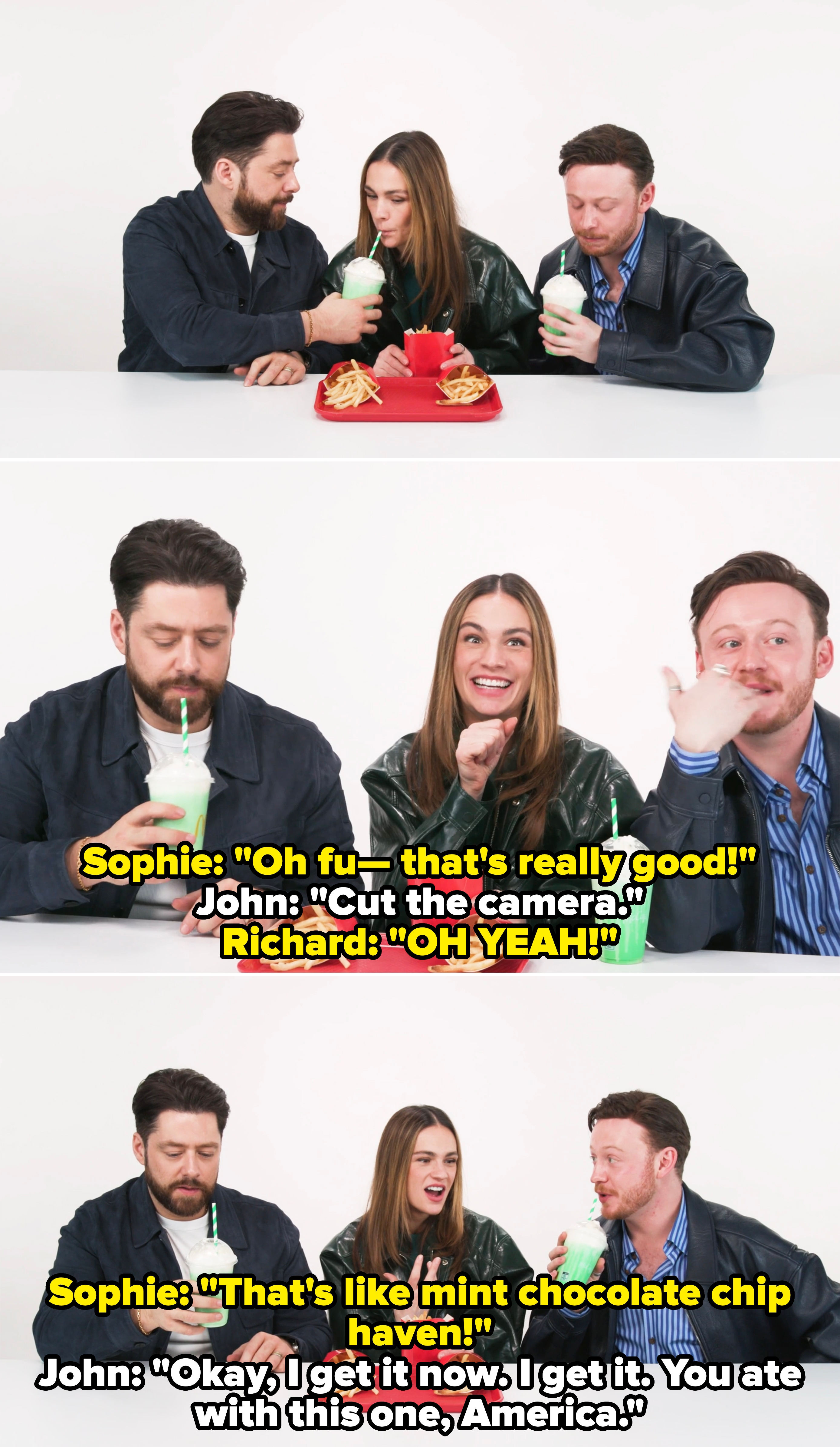 Looks like McDonald's Shamrock Shake has three new fans, and they are "Outlander" stars Richard Rankin, Sophie Skelton, and John Bell. As a Senior Talent Booker and Producer at BuzzFeed, you can typically catch me flailing about the buzziest TV shows and movies. Previous seasons are also streaming on Netflix.