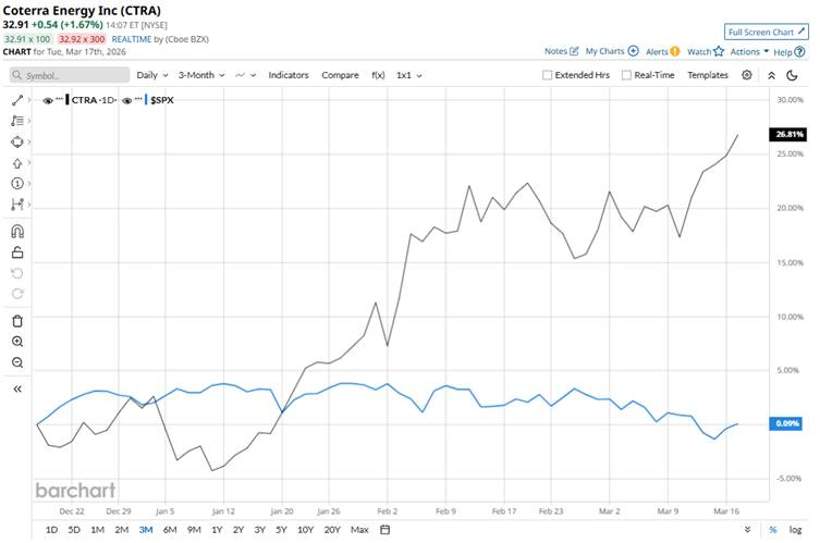 Coterra Energy Inc. (CTRA) is an independent oil and natural gas exploration and production company headquartered in Houston. Formed through the merger of Cabot Oil & Gas and Cimarex Energy, the company focuses on developing high-quality assets across key U.S. basins, including the Permian Basin and the Marcellus Shale. Coterra specializes in the production of crude oil, natural gas, and natural gas liquids, leveraging a disciplined capital allocation strategy and low-cost operations to drive shareholder returns. The company has a market cap of approximately $25 billion. Companies valued at over $10 billion are typically classified as “large-cap stocks,” and Coterra Energy Inc. fits the label perfectly. The energy giant emphasizes innovation, operational efficiency, and sustainable development as core pillars of its strategy, positioning the company to deliver consistent production and long-term shareholder value. As Oracle Reveals Higher Restructuring Costs, Should You Still Buy ORCL Stock or Stay Far Away? This Dividend King With a 54-Year Dividend Streak Is Down 13% YTD. Time to Buy the Dip? Stop Fighting Time Decay: How Credit Spreads Change the Game for Options Traders Our exclusive Barchart Brief newsletter is your FREE midday guide to what's moving stocks, sectors, and investor sentiment - delivered right when you need the info most. Subscribe today! CTRA is currently hovering near its 52-week high of $32.99, reached on Mar. 17. Shares of this oil and gas company have gained 26.7% over the past three months, outpacing the broader S&P 500 Index’s ($SPX) marginal returns during the same time frame. CTRA has surged 16.7% over the past 52 weeks, slightly underperforming SPX’s 18.5% returns. However, shares are up 24.7% on a YTD basis, massively outperforming SPX’s 1.8% decline over the same time frame. To confirm its bullish price trend, CTRA has been trading above the 50-day and 200-day moving averages since mid-January. n 2026, Coterra Energy stock is rising primarily due to its definitive merger agreement with Devon Energy Corporation (DVN), an all-stock transaction announced in February that is expected to close in the second quarter. Investors are reacting positively to the combined entity's potential for meaningfully enhanced free cash flow and a more robust shareholder return program, including a strong share buyback initiative. Furthermore, the stock has been bolstered by rising crude oil prices driven by geopolitical tensions in the Middle East. In comparison, rival Expand Energy Corporation (EXE) has underperformed CTRA stock. EXE stock has soared 1.3% over the past 52 weeks and decline 3.1% on a YTD basis. Analysts remain optimistic about CTRA’s prospects. The stock has a consensus rating of “Moderate Buy” from the 24 analysts covering it, and the mean price target of $34.48 suggests a notable 6.5% premium to its current levels. On the date of publication, Subhasree Kar did not have (either directly or indirectly) positions in any of the securities mentioned in this article. All information and data in this article is solely for informational purposes. This article was originally published on Barchart.com